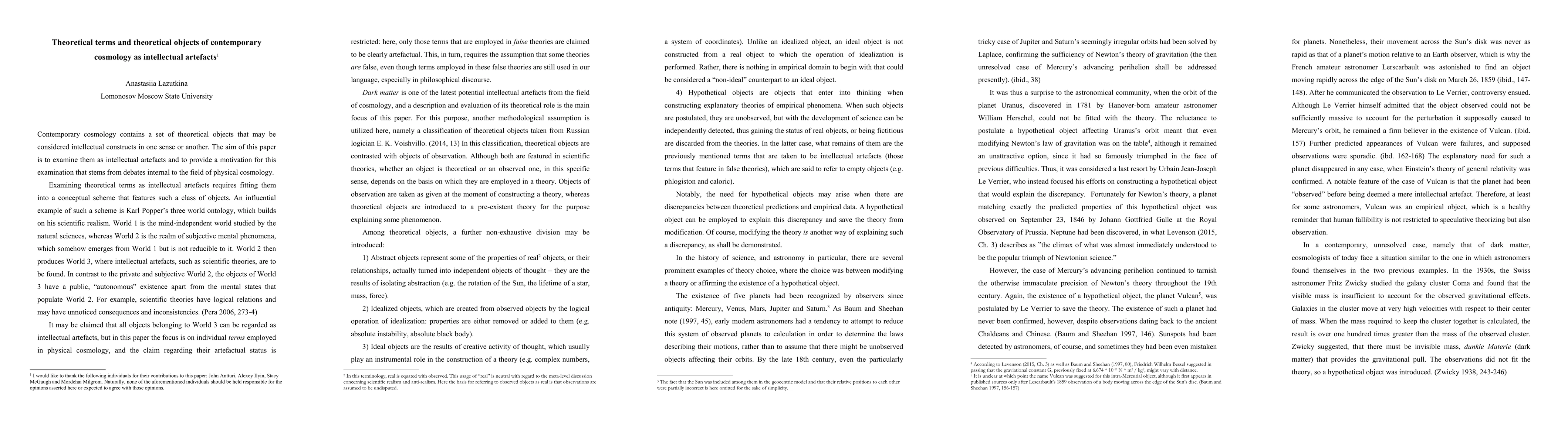 In this paper, the theoretical terms of contemporary cosmology are examined as intellectual artefacts. An ontology and methodology are introduced for this purpose, which includes defining the concept of a hypothetical object. Introducing a hypothetical object is contrasted with the modification of physical laws as alternative ways of explaining the discrepancy between observations and theoretical predictions. Historical examples of theory choice, which involved these alternatives, are discussed. This is followed by a study of theory choice in contemporary cosmology. In particular, the focus is on the case of dark matter and modified gravity as alternative explanations for observed mass discrepancies in galaxies and galaxy clusters. These alternatives are analyzed, and their similarities and differences to the historical examples are pointed out.