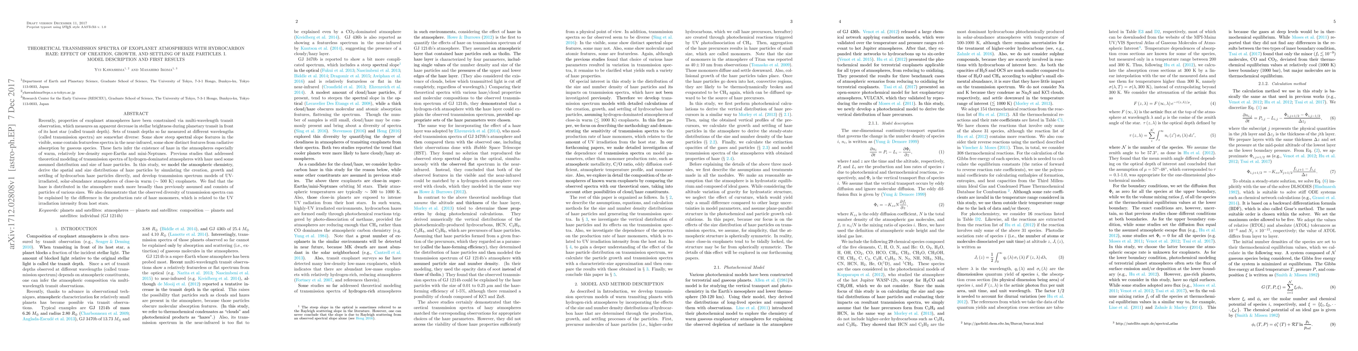 This paper models the atmospheric chemistry and simulates the formation, growth, and settling of hydrocarbon haze particles in exoplanet atmospheres, finding that haze distribution and size vary widely. The study shows that the diversity in observed transmission spectra can be explained by differences in the production rate of haze monomers influenced by the UV irradiation from host stars.