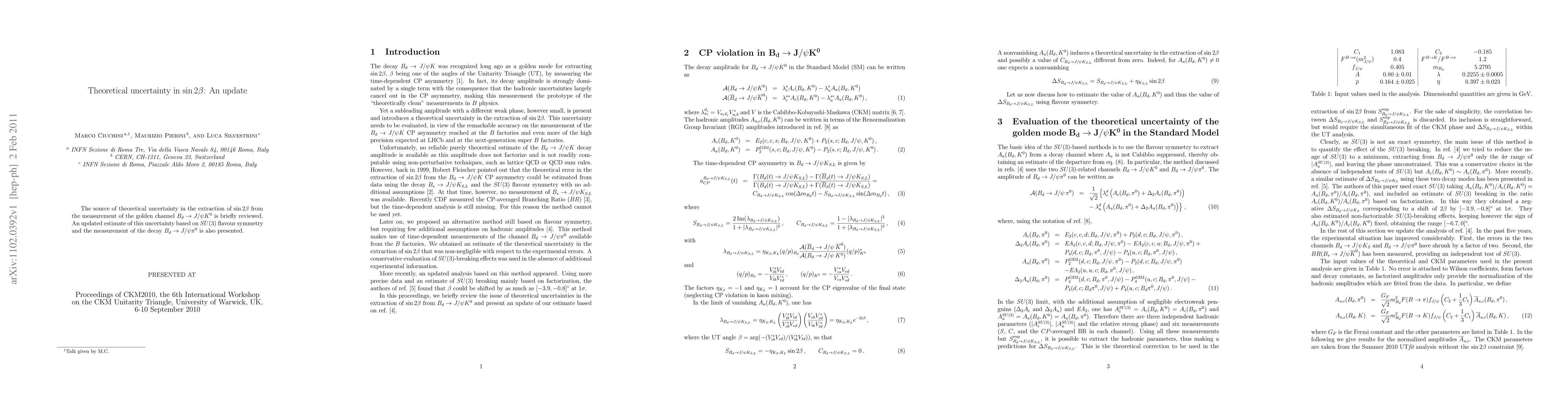 The source of theoretical uncertainty in the extraction of sin 2beta from the measurement of the golden channel Bd -> J/psi K0 is briefly reviewed. An updated estimate of this uncertainty based on SU(3) flavour symmetry and the measurement of the decay Bd -> J/psi pi0 is also presented.
