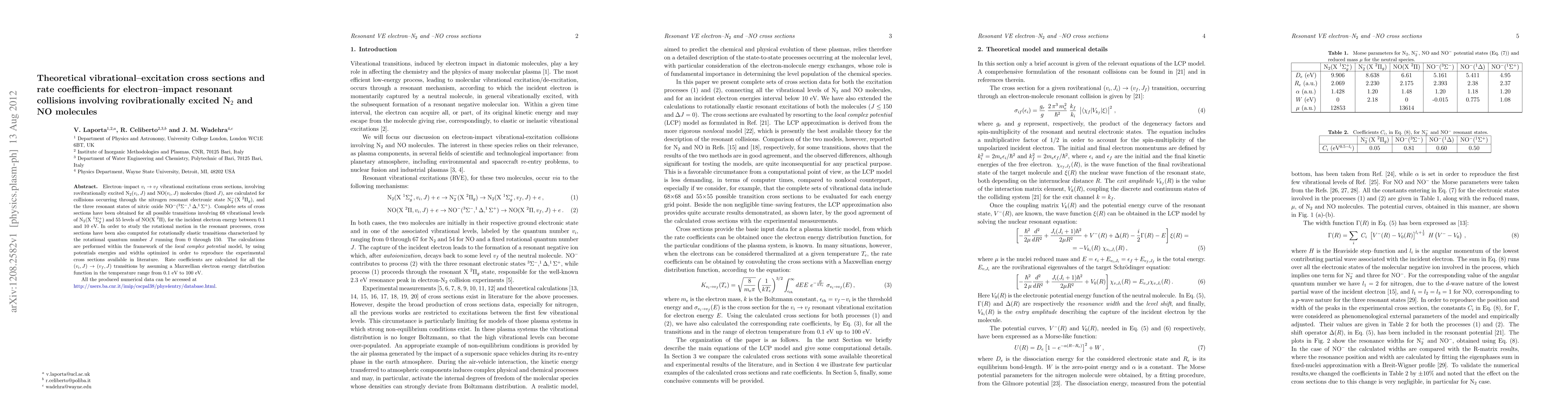 This paper calculates theoretical cross sections and rate coefficients for electron-impact vibrational excitations in rovibrationally excited N2 and NO molecules, focusing on resonant collisions through specific electronic states. The results, obtained using the local complex potential model, cover a wide range of vibrational and rotational transitions and are available for download online.