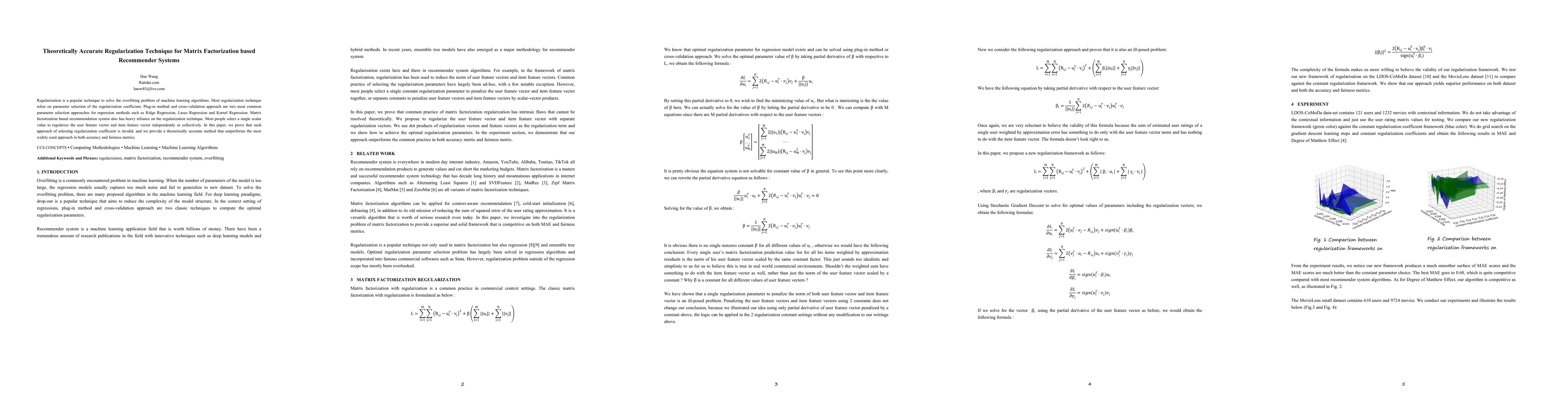 This paper introduces a theoretically accurate regularization technique for matrix factorization in recommender systems, proving that traditional methods of selecting regularization coefficients are invalid. The proposed method outperforms existing approaches in both accuracy and fairness metrics.
