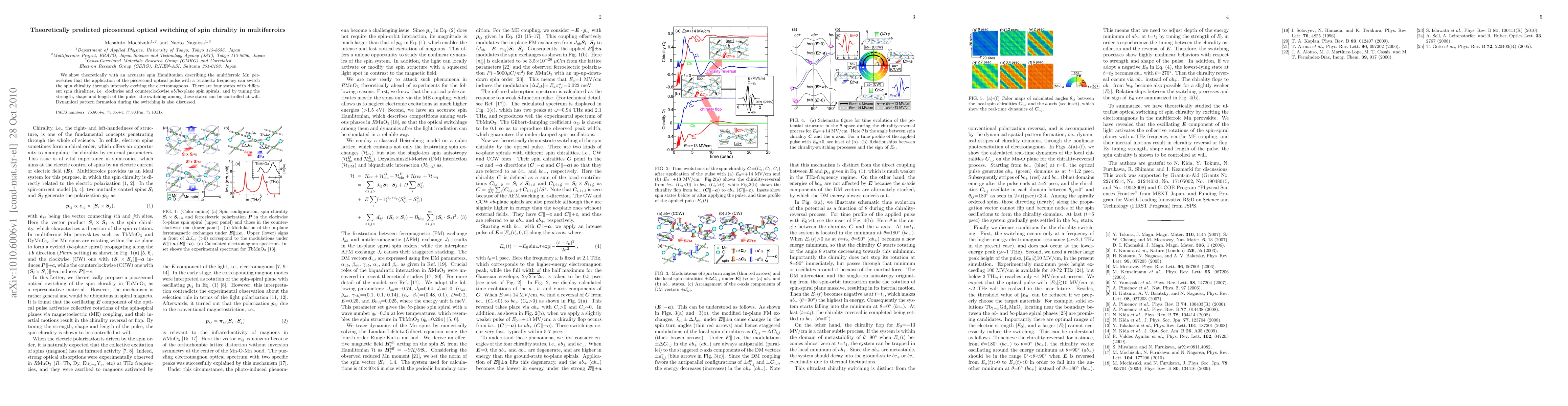 We show theoretically with an accurate spin Hamiltonian describing the multiferroic Mn perovskites that the application of the picosecond optical pulse with a terahertz frequency can switch the spin chirality through intensely exciting the electromagnons. There are four states with different spin chiralities, i.e. clockwise and counterclockwise ab/bc-plane spin spirals, and by tuning the strength, shape and length of the pulse, the switching among these states can be controlled at will. Dynamical pattern formation during the switching is also discussed.