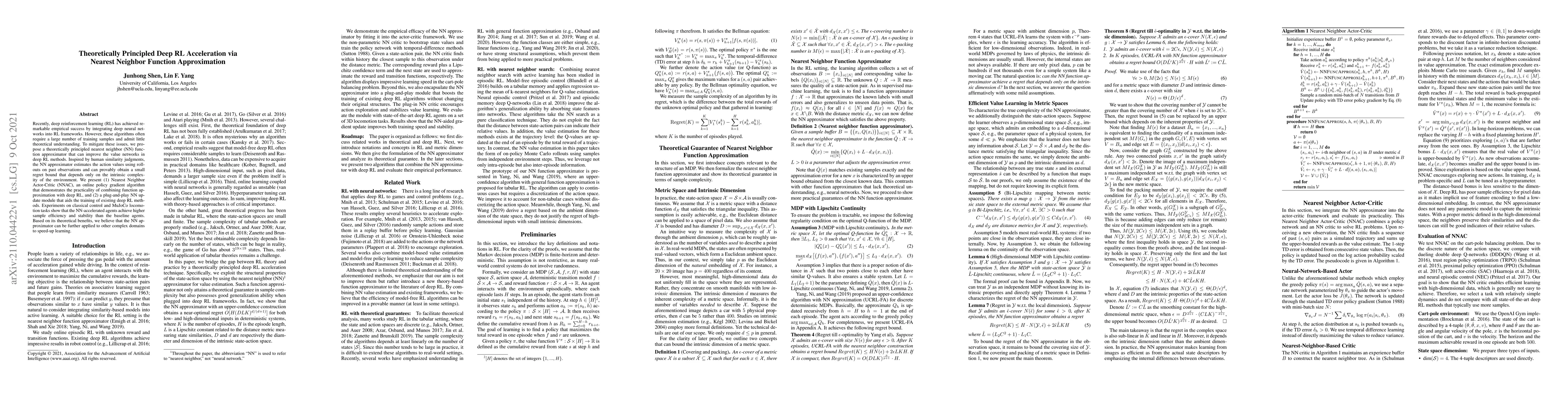 Recently, deep reinforcement learning (RL) has achieved remarkable empirical success by integrating deep neural networks into RL frameworks. However, these algorithms often require a large number of training samples and admit little theoretical understanding. To mitigate these issues, we propose a theoretically principled nearest neighbor (NN) function approximator that can improve the value networks in deep RL methods. Inspired by human similarity judgments, the NN approximator estimates the action values using rollouts on past observations and can provably obtain a small regret bound that depends only on the intrinsic complexity of the environment. We present (1) Nearest Neighbor Actor-Critic (NNAC), an online policy gradient algorithm that demonstrates the practicality of combining function approximation with deep RL, and (2) a plug-and-play NN update module that aids the training of existing deep RL methods. Experiments on classical control and MuJoCo locomotion tasks show that the NN-accelerated agents achieve higher sample efficiency and stability than the baseline agents. Based on its theoretical benefits, we believe that the NN approximator can be further applied to other complex domains to speed-up learning.