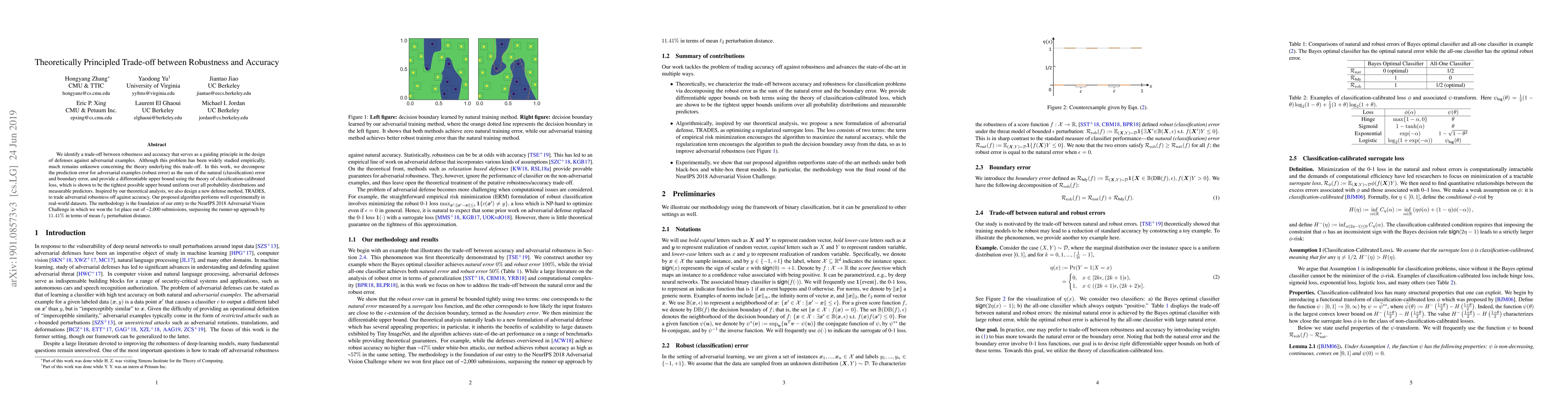 This paper establishes a theoretical framework for understanding the trade-off between robustness and accuracy in machine learning models, decomposing adversarial errors into natural and boundary components. It introduces a new method, TRADES, that leverages this theory, achieving first place in the NeurIPS 2018 Adversarial Vision Challenge by significantly reducing adversarial perturbation distances.
