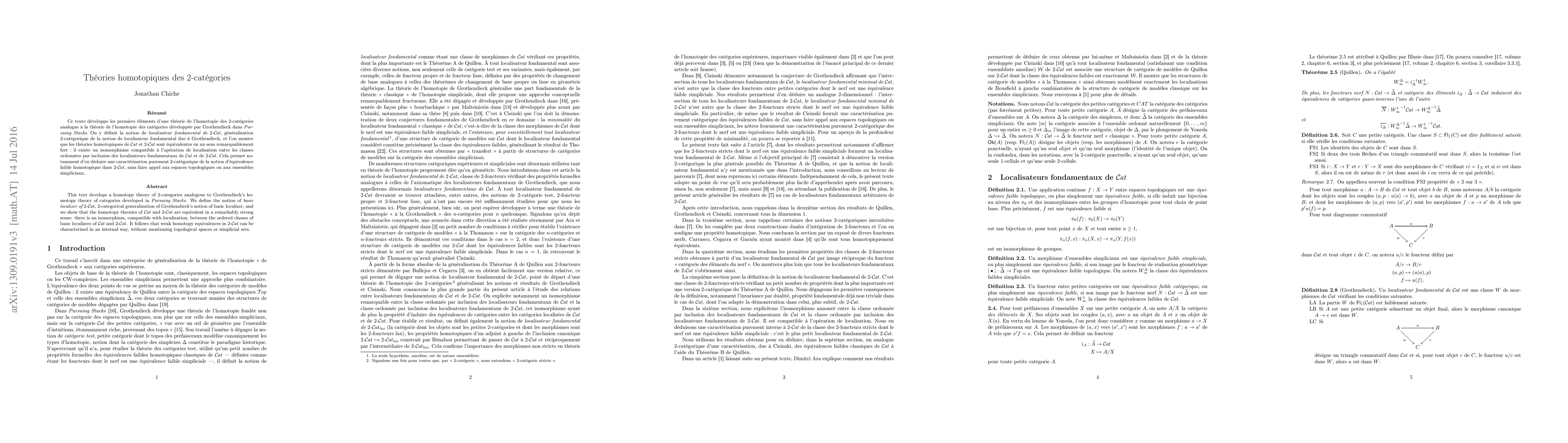 The paper develops a homotopy theory for 2-categories, analogous to Grothendieck's theory for categories, by defining a 'basic localizer of 2-Cat' and showing an equivalence between the homotopy theories of Cat and 2-Cat.