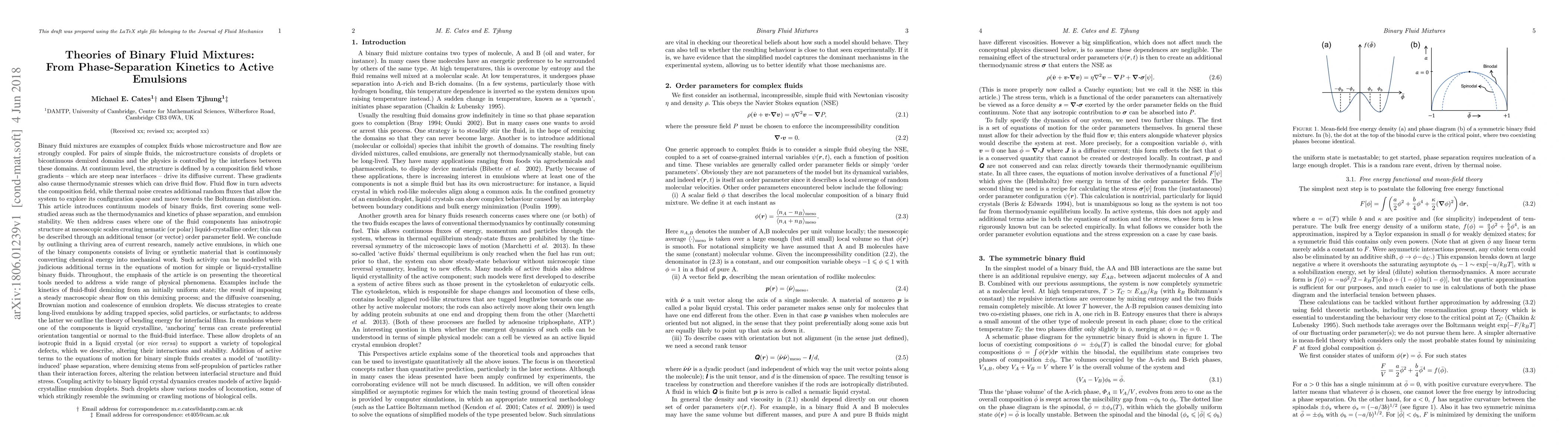 Binary fluid mixtures are examples of complex fluids whose microstructure and flow are strongly coupled. For pairs of simple fluids, the microstructure consists of droplets or bicontinuous demixed domains and the physics is controlled by the interfaces between these domains. At continuum level, the structure is defined by a composition field whose gradients which are steep near interfaces drive its diffusive current. These gradients also cause thermodynamic stresses which can drive fluid flow. Fluid flow in turn advects the composition field, while thermal noise creates additional random fluxes that allow the system to explore its configuration space and move towards the Boltzmann distribution. This article introduces continuum models of binary fluids, first covering some well-studied areas such as the thermodynamics and kinetics of phase separation, and emulsion stability. We then address cases where one of the fluid components has anisotropic structure at mesoscopic scales creating nematic (or polar) liquid-crystalline order; this can be described through an additional tensor (or vector) order parameter field. We conclude by outlining a thriving area of current research, namely active emulsions, in which one of the binary components consists of living or synthetic material that is continuously converting chemical energy into mechanical work.