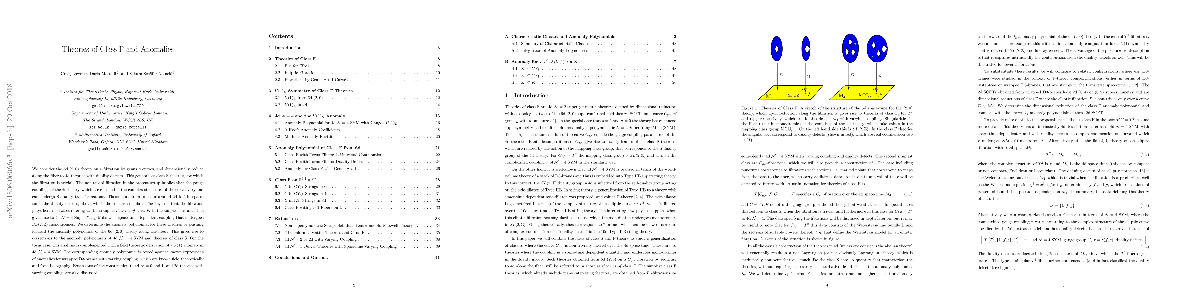 This paper explores 6d (2,0) theories on genus g curve fibrations, reducing them to 4d theories with varying gauge couplings and S-duality transformations. It introduces "theories of class F" and determines their anomaly polynomials, revealing corrections to those of class S theories, and discusses U(1) anomalies in 4d N=4 Super-Yang-Mills.