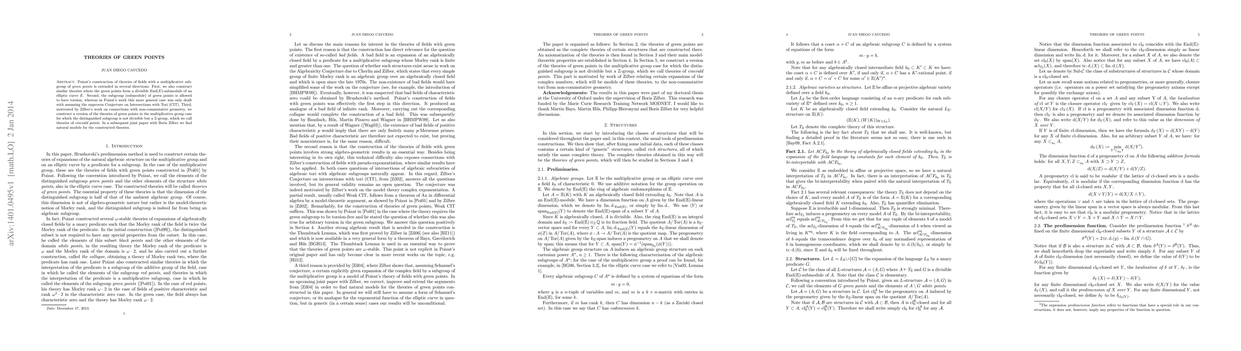 Poizat's construction of theories of fields with a multiplicative subgroup of green points is extended in several directions: First, we also construct similar theories where the green points form a divisible $\operatorname{End}(E)$-submodule of an elliptic curve $E$. Second, the subgroup (submodule) of green points is allowed to have torsion, whereas in Poizat's work this more general case was only dealt with assuming the unproven Conjecture on Intersections with Tori (CIT). Third, motivated by Zilber's work on connections with non-commutative geometry, we construct a version of the theories of green points in the multiplicative group case for which the distinguished subgroup is not divisible but a $\mathbb{Z}$-group, which we call theories of emerald points. In a subsequent joint paper with Boris Zilber we find natural models for the constructed theories.