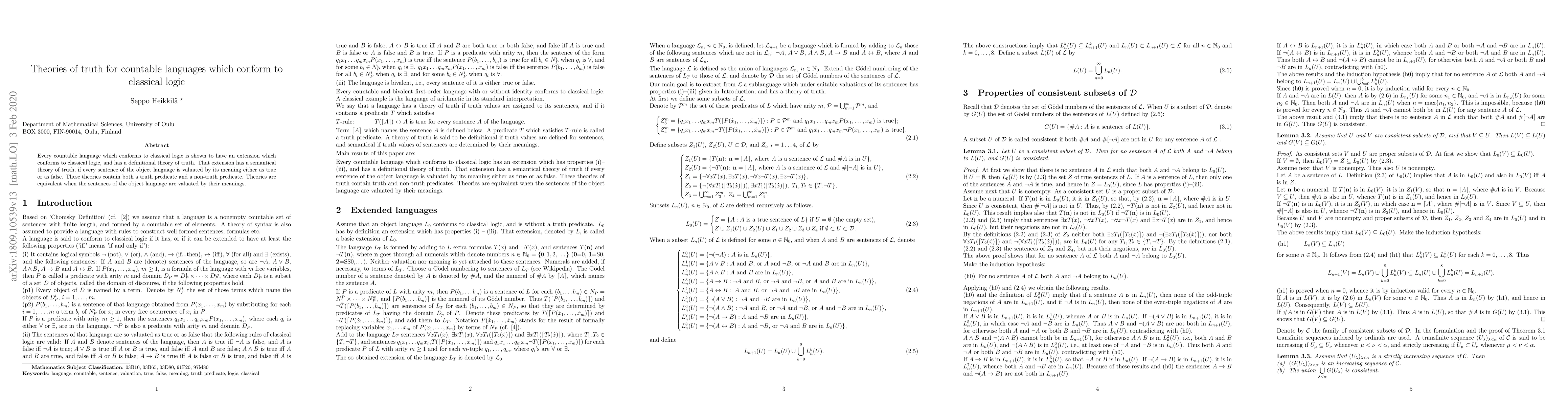 Every countable language which conforms to classical logic is shown to have an extension which conforms to classical logic, and has a definitional theory of truth. That extension has a semantical theory of truth, if every sentence of the object language is valuated by its meaning either as true or as false. These theories contain both a truth predicate and a non-truth predicate. Theories are equivalent when the sentences of the object language are valuated by their meanings.