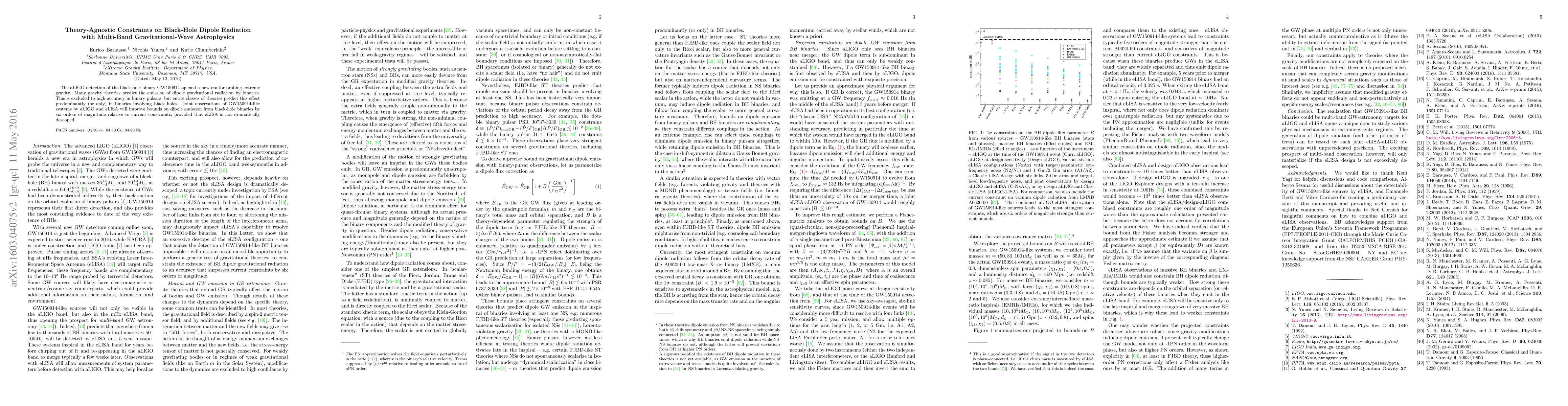 Research on gravitational wave radiation from black-hole binaries reveals that joint observations of aLIGO and eLISA could improve constraints on dipole emission by six orders of magnitude. This would help rule out or confirm theories predicting this effect in binary systems.