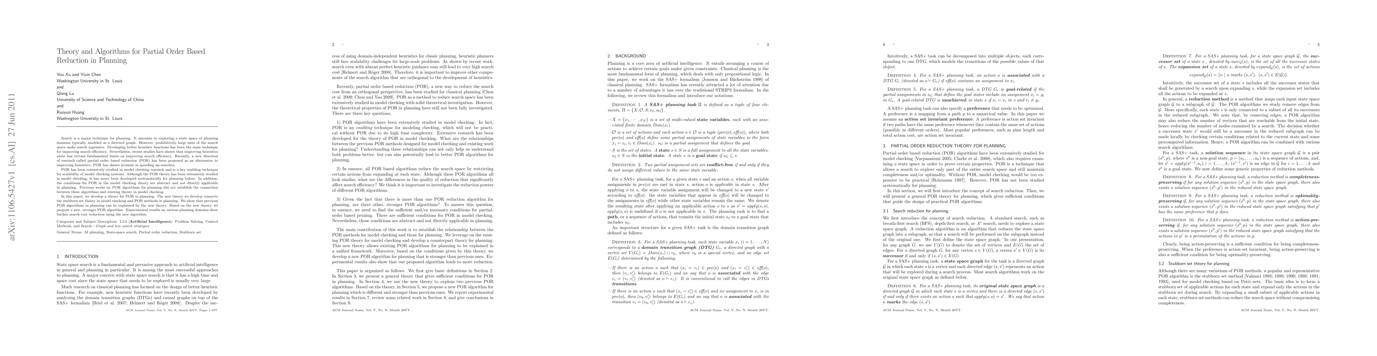 This paper develops a theory for Partial Order Based Reduction (POR) in planning, connecting it to model checking theory and proposing a new, stronger algorithm that reduces search cost in various planning domains.