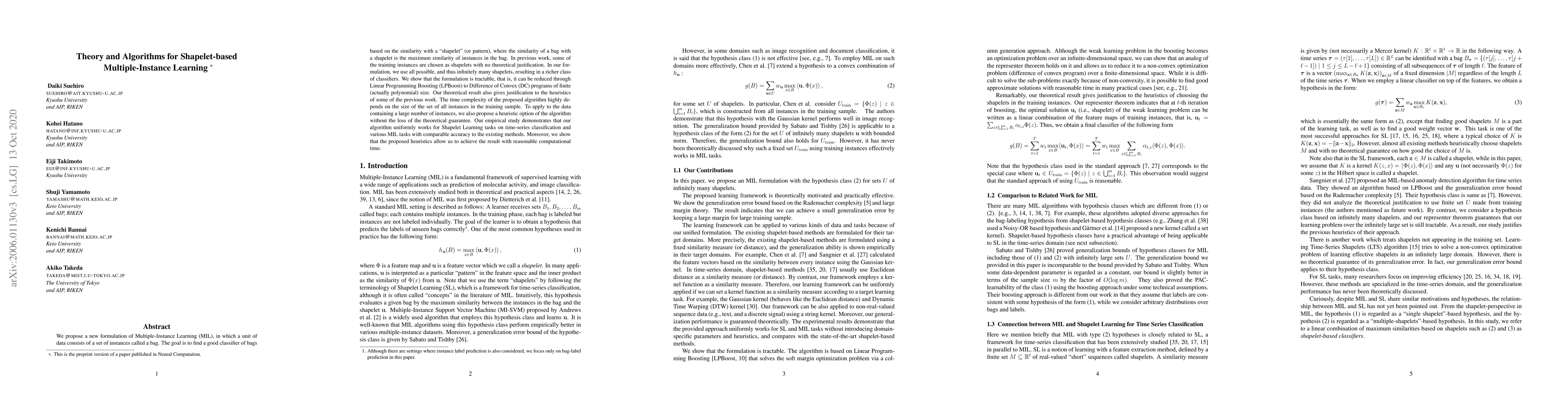 Researchers propose a new approach to Multiple-Instance Learning, using shapelets to classify bags of instances, and show that their algorithm is both theoretically justified and computationally efficient.