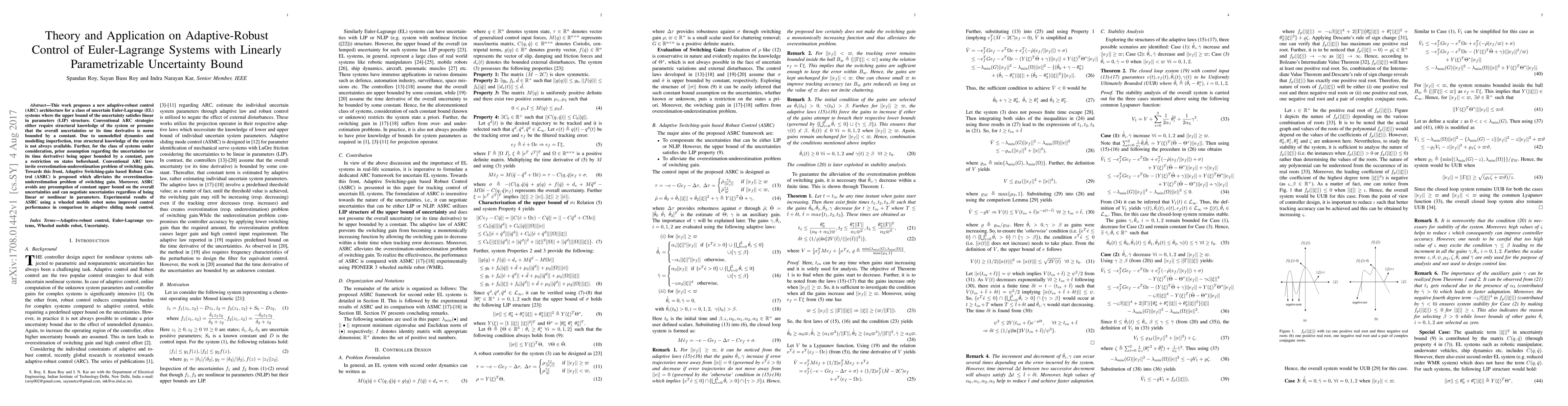 This work proposes a new adaptive-robust control (ARC) architecture for a class of uncertain Euler-Lagrange (EL) systems where the upper bound of the uncertainty satisfies linear in parameters (LIP) structure. Conventional ARC strategies either require structural knowledge of the system or presume that the overall uncertainties or its time derivative are norm bounded by a constant. Due to unmodelled dynamics and modelling imperfection, true structural knowledge of the system is not always available. Further, for the class of systems under consideration, prior assumption regarding the uncertainties (or its time derivative) being upper bounded by a constant, puts a restriction on states beforehand. Conventional ARC laws invite overestimation-underestimation problem of switching gain. Towards this front, Adaptive Switching-gain based Robust Control (ASRC) is proposed which alleviates the overestimation-underestimation problem of switching gain. Moreover, ASRC avoids any presumption of constant upper bound on the overall uncertainties and can negotiate uncertainties regardless of being linear or nonlinear in parameters. Experimental results of ASRC using a wheeled mobile robot notes improved control performance in comparison to adaptive sliding mode control.