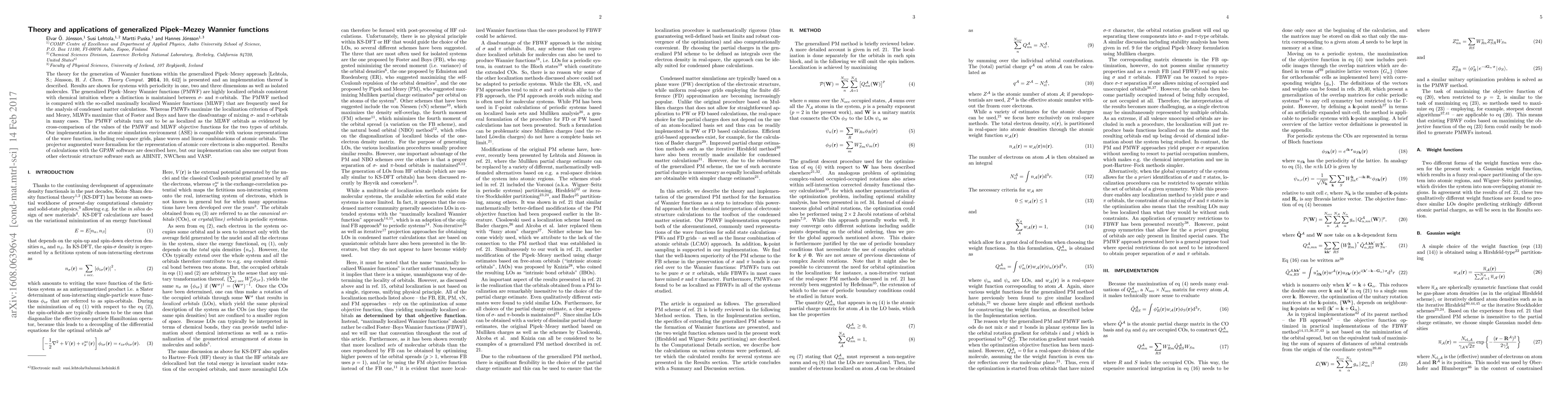 The theory for the generation of Wannier functions within the generalized Pipek--Mezey approach [Lehtola, S.; J\'onsson, H. J. Chem. Theory Comput. 2014, 10, 642] is presented and an implementation thereof is described. Results are presented for systems with periodicity in one, two and three dimensions as well as isolated molecules. The generalized Pipek--Mezey Wannier functions (PMWF) are highly localized orbitals consistent with chemical intuition where a distinction is maintained between {\sigma}- and {\pi}-orbitals. The PMWF method is compared with the so-called maximally localized Wannier functions (MLWF) that are frequently used for the analysis of condensed matter calculations. Whereas PMWFs maximize the localization criterion of Pipek and Mezey, MLWFs maximize that of Foster and Boys and have the disadvantage of mixing {\sigma}- and {\pi}-orbitals in many cases. The PMWF orbitals turn out to be as localized as the MLWF orbitals as evidenced by cross-comparison of the values of the PMWF and MLWF objective functions for the two types of orbitals. Our implementation in the atomic simulation environment (ASE) is compatible with various representations of the wave function, including real-space grids, plane waves and linear combinations of atomic orbitals. The projector augmented wave formalism for the representation of atomic core electrons is also supported. Results of calculations with the GPAW software are described here, but our implementation can also use output from other electronic structure software such as ABINIT, NWChem and VASP.