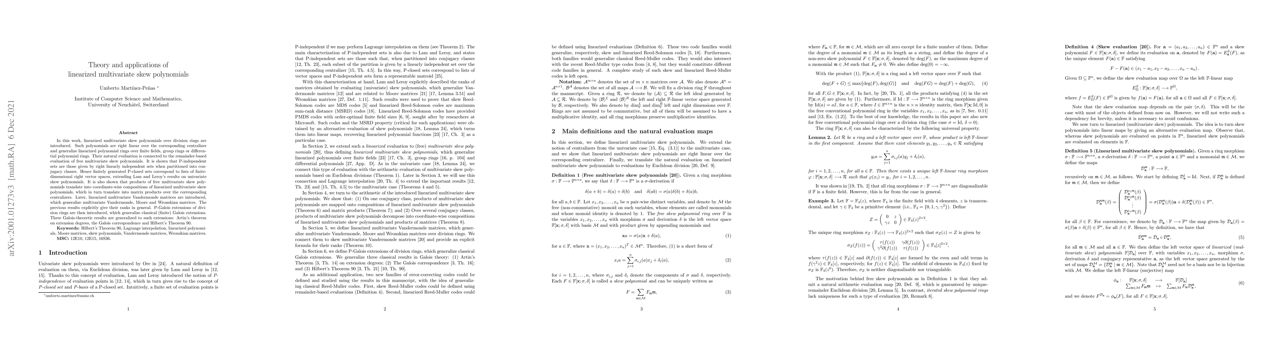 In this work, linearized multivariate skew polynomials over division rings are introduced. Such polynomials are right linear over the corresponding centralizer and generalize linearized polynomial rings over finite fields, group rings or differential polynomial rings. Their natural evaluation is connected to the remainder-based evaluation of free multivariate skew polynomials. It is shown that P-independent sets are those given by right linearly independent sets when partitioned into conjugacy classes. Hence finitely generated P-closed sets correspond to lists of finite-dimensional right vector spaces, extending Lam and Leroy's results on univariate skew polynomials. It is also shown that products of free multivariate skew polynomials translate into coordinate-wise compositions of linearized multivariate skew polynomials, which in turn translate into matrix products over the corresponding centralizers. Later, linearized multivariate Vandermonde matrices are introduced, which generalize multivariate Vandermonde, Moore and Wronskian matrices. The previous results explicitly give their ranks in general. P-Galois extensions of division rings are then introduced, which generalize classical (finite) Galois extensions. Three Galois-theoretic results are generalized to such extensions: Artin's theorem on extension degrees, the Galois correspondence and Hilbert's Theorem 90.