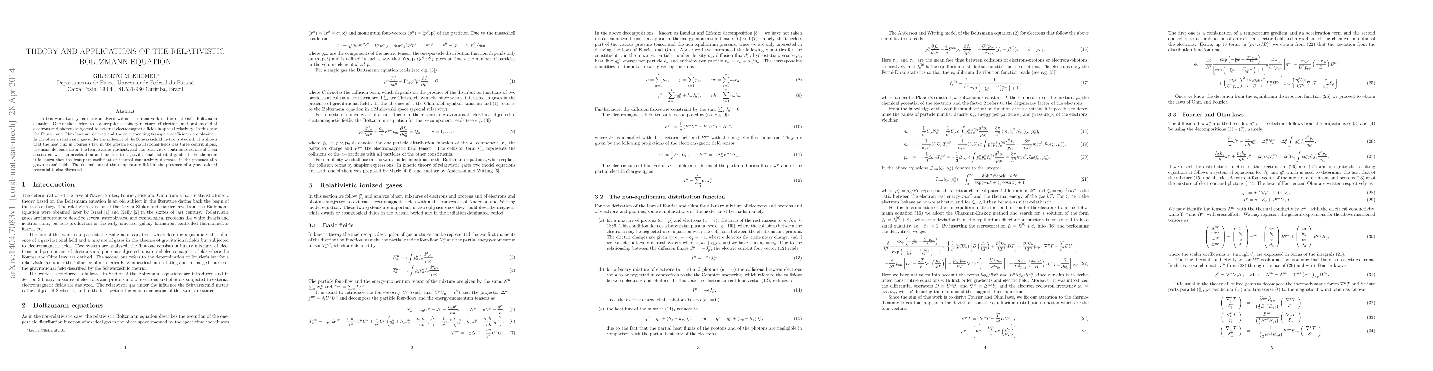 This paper explores the relativistic Boltzmann equation to analyze binary mixtures under electromagnetic fields and relativistic gases influenced by gravitational fields, deriving Fourier and Ohm laws, and revealing that thermal conductivity decreases with gravitational fields, introducing relativistic contributions to heat flux.