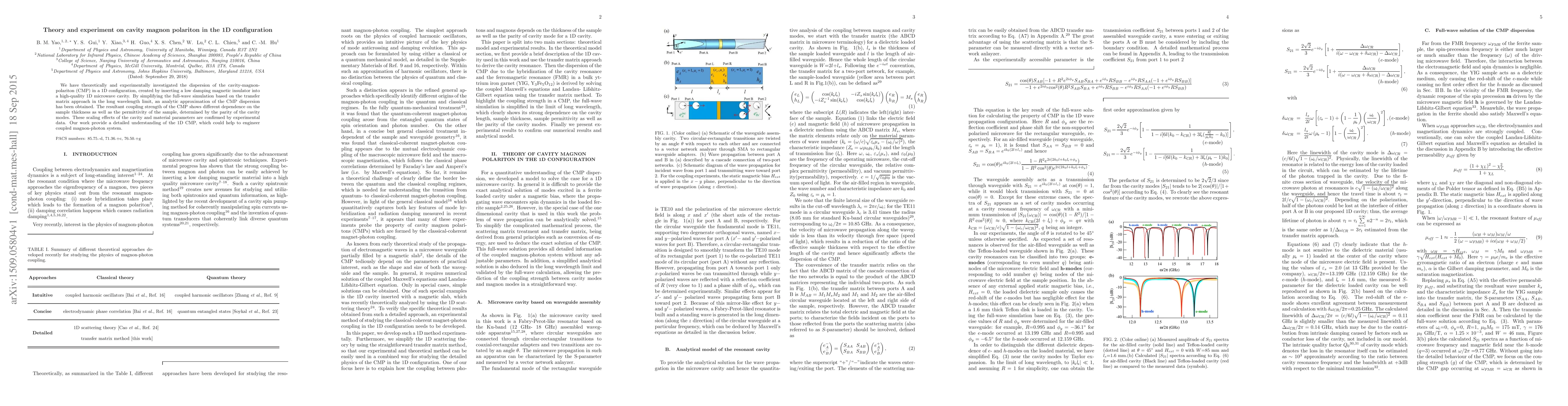 This paper investigates both theoretically and experimentally the dispersion of cavity-magnon-polaritons in a 1D configuration, revealing how coupling strength depends on sample thickness and permittivity. The findings provide insights into the engineering of coupled magnon-photon systems.