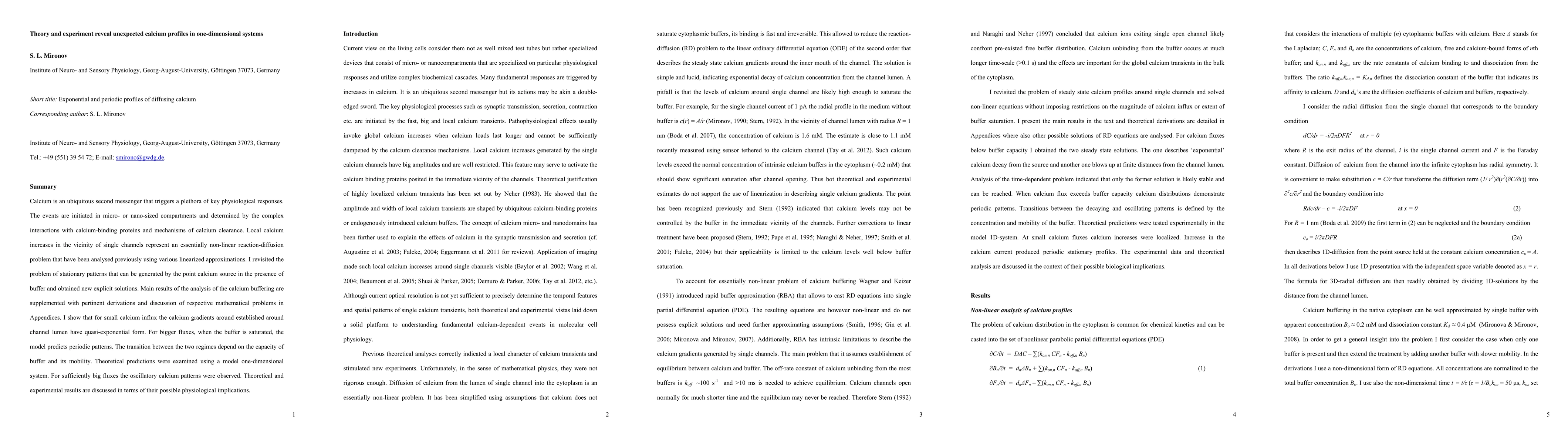 Calcium is an ubiquitous second messenger that triggers a plethora of key physiological responses. The events are initiated in micro- or nano-sized compartments and determined by the complex interactions with calcium-binding proteins and mechanisms of calcium clearance. Local calcium increases in the vicinity of single channels represent an essentially non-linear reaction-diffusion problem that have been analysed previously using various linearized approximations. I revisited the problem of stationary patterns that can be generated by the point calcium source in the presence of buffer and obtained new explicit solutions. Main results of the analysis of the calcium buffering are supplemented with pertinent derivations and discussion of respective mathematical problems in Appendices. I show that for small calcium influx the calcium gradients around established around channel lumen have quasi-exponential form. For bigger fluxes, when the buffer is saturated, the model predicts periodic patterns. The transition between the two regimes depend on the capacity of buffer and its mobility. Theoretical predictions were examined using a model one-dimensional system. For sufficiently big fluxes the oscillatory calcium patterns were observed. Theoretical and experimental results are discussed in terms of their possible physiological implications.