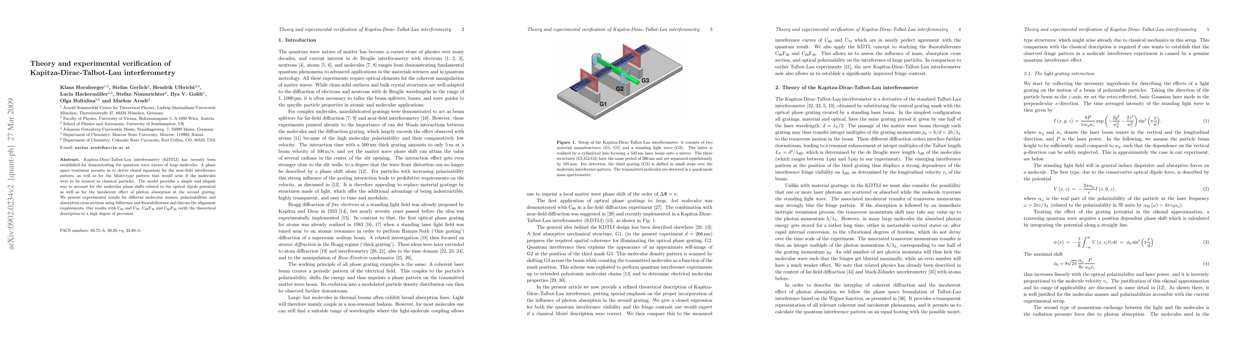 This paper presents a theoretical framework for Kapitza-Dirac-Talbot-Lau interferometry (KDTLI) to demonstrate the quantum wave nature of large molecules, deriving equations for near-field interference patterns. Experimental results using fullerenes and fluorofullerenes confirm the theoretical model with high precision.
