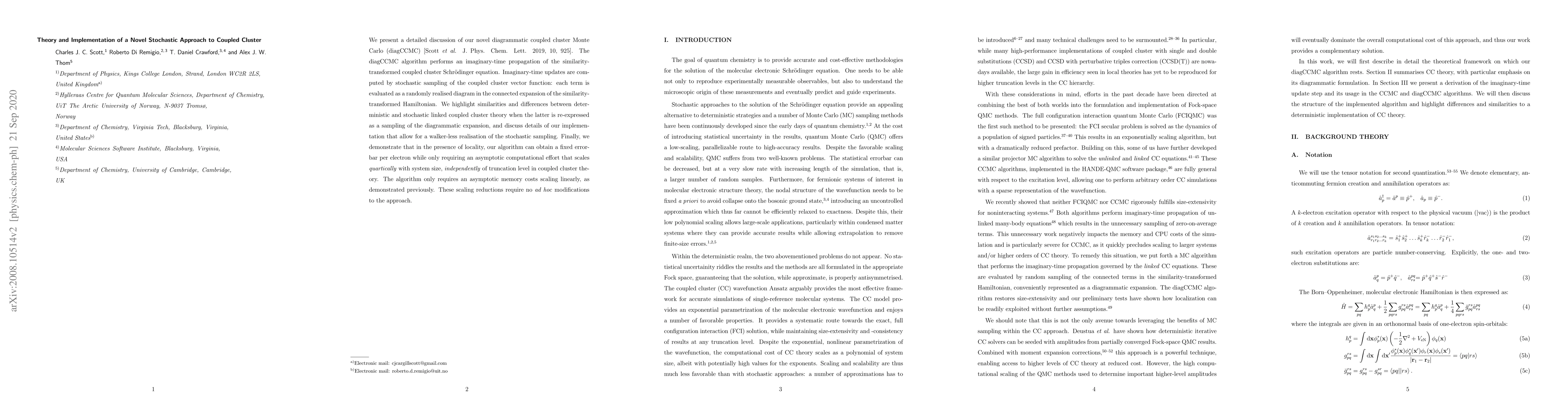 We present a detailed discussion of our novel diagrammatic coupled cluster Monte Carlo (diagCCMC) [Scott et al. J. Phys. Chem. Lett. 2019, 10, 925]. The diagCCMC algorithm performs an imaginary-time propagation of the similarity-transformed coupled cluster Schr\"odinger equation. Imaginary-time updates are computed by stochastic sampling of the coupled cluster vector function: each term is evaluated as a randomly realised diagram in the connected expansion of the similarity-transformed Hamiltonian. We highlight similarities and differences between deterministic and stochastic linked coupled cluster theory when the latter is re-expressed as a sampling of the diagrammatic expansion, and discuss details of our implementation that allow for a walker-less realisation of the stochastic sampling. Finally, we demonstrate that in the presence of locality, our algorithm can obtain a fixed errorbar per electron while only requiring an asymptotic computational effort that scales quartically with system size, independently of truncation level in coupled cluster theory. The algorithm only requires an asymptotic memory costs scaling linearly, as demonstrated previously. These scaling reductions require no ad hoc modifications to the approach.
