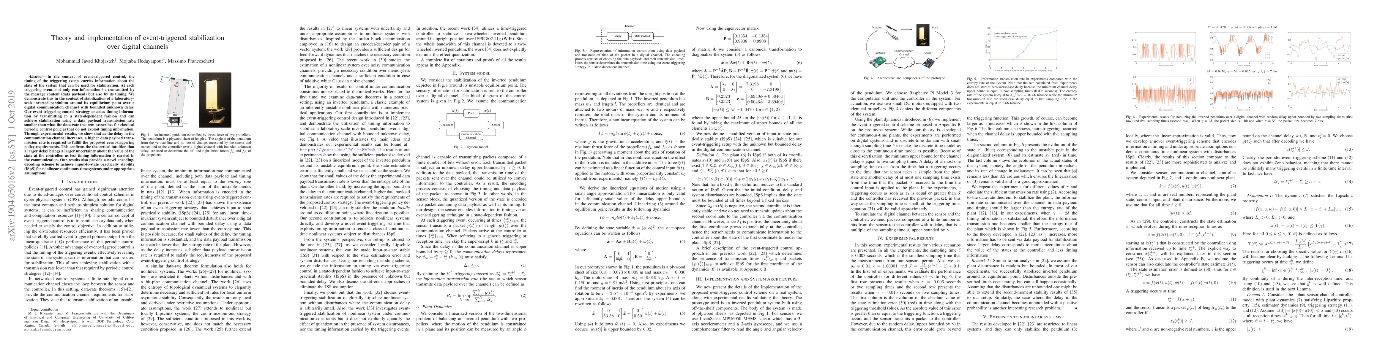 This paper presents an event-triggered control strategy for stabilizing a laboratory-scale inverted pendulum over a digital channel with unknown delay, utilizing both message content and timing for stabilization. Experimental results show that higher data rates are needed for larger delays, confirming theoretical insights on timing information's role in stabilization.