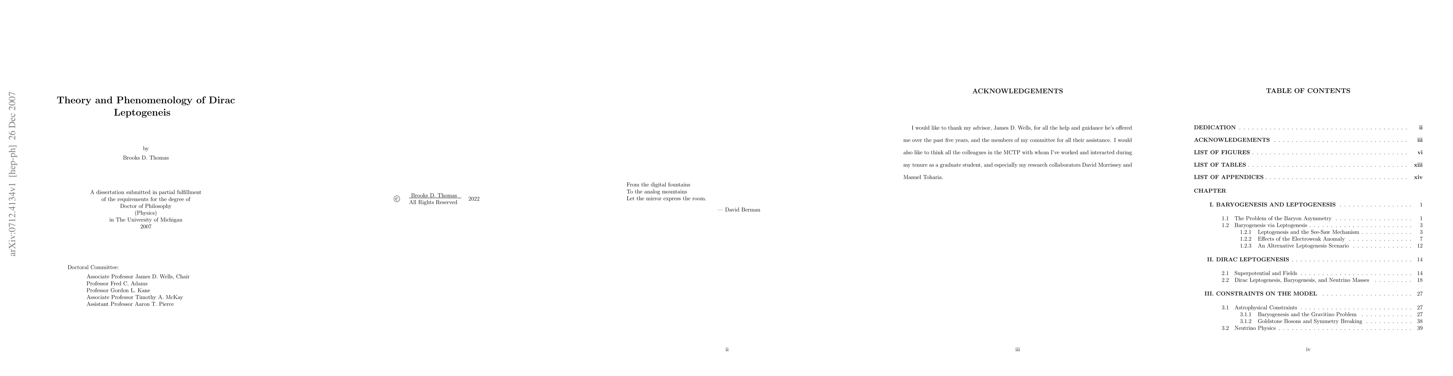 Dirac leptogenesis, in which neutrinos are purely Dirac and develop small but nonzero effective masses without the aid of the see-saw mechanism, provides an interesting alternative to the standard leptogenesis picture. Here we review the theory and phenomenology of Dirac leptogenesis and show that it is a viable theory capable of simultaneously satisfying all relevant bounds from cosmology, neutrino physics, and flavor violation. In addition, we also explore several potential extensions of the model, such as the possibility of right-handed sneutrino dark matter and the potential for relating the leptogenesis mechanism to the origin of the mu-term. Theories with a heavy gravitino and gaugino masses generated by anomaly mediation emerge as one natural context for Dirac leptogenesis. In such models the lightest neutralino is often expected to be predominately wino or Higgsino, and is a viable dark matter candidate. We conclude with an examination of the prospects for detecting the effectively monoenergetic photon signal that results from the annihilation of such a dark matter particle in the galactic halo.