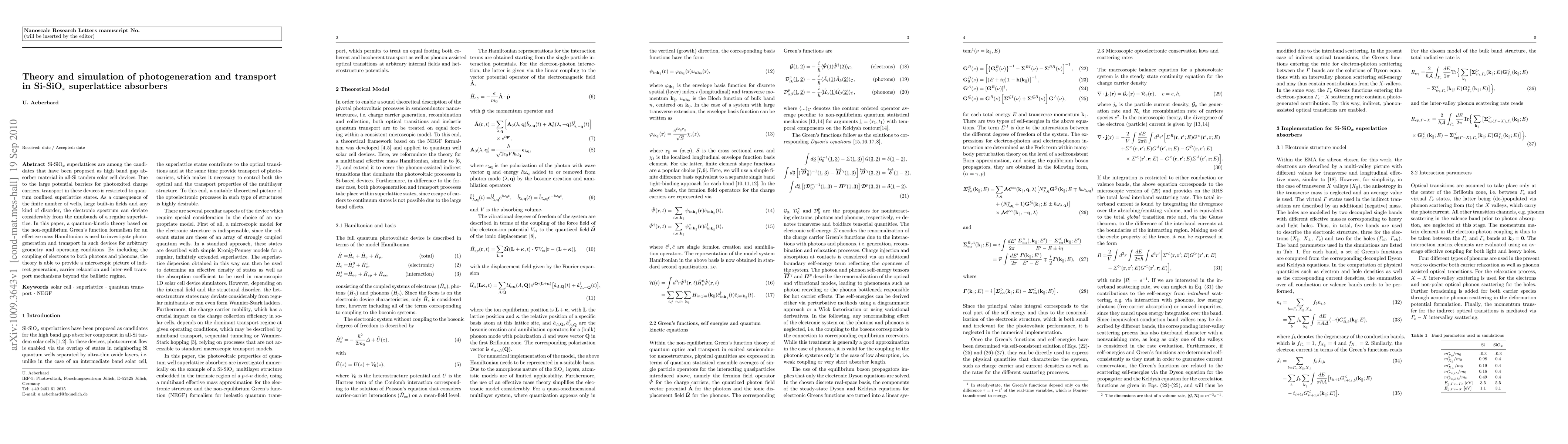 Si-SiOx superlattices are among the candidates that have been proposed as high band gap absorber material in all-Si tandem solar cell devices. Due to the large potential barriers for photoexited charge carriers, transport in these devices is restricted to quantum confined superlattice states. As a consequence of the finite number of wells, large built-in fields and any kind of disorder, the electronic spectrum can deviate considerably from the minibands of a regular superlattice. In this paper, a quantum-kinetic theory based on the non-equilibrium Green's function formalism for an effective mass Hamiltonian is used to investigate photogeneration and transport in such devices for arbitrary geometry and operating conditions. By including the coupling of electrons to both photons and phonons, the theory is able to provide a microscopic picture of indirect generation, carrier relaxation and inter-well transport mechanisms beyond the ballistic regime.