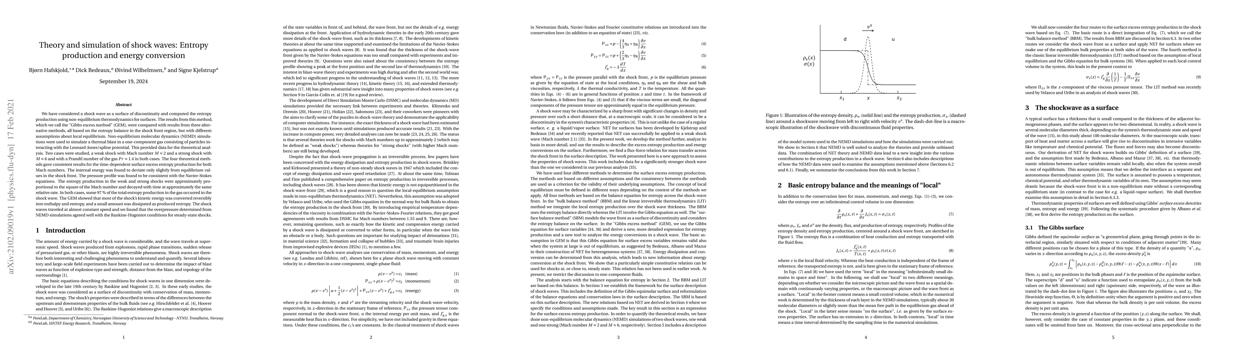 We have considered a shock wave as a surface of discontinuity and computed the entropy production using non-equilibrium thermodynamics for surfaces. The results from this method, which we call the "Gibbs excess method" (GEM), were compared with results from three alternative methods, all based on the entropy balance in the shock front region, but with different assumptions about local equilibrium. Non-equilibrium molecular dynamics (NEMD) simulations were used to simulate a thermal blast in a one-component gas consisting of particles interacting with the Lennard-Jones/spline potential. This provided data for the theoretical analysis. Two cases were studied, a weak shock with Mach number $M \approx 2$ and a strong shock with $M \approx 6$ and with a Prandtl number of the gas $Pr \approx 1.4$ in both cases. The four theoretical methods gave consistent results for the time-dependent surface excess entropy production for both Mach numbers. The internal energy was found to deviate only slightly from equilibrium values in the shock front. The pressure profile was found to be consistent with the Navier-Stokes equations. The entropy production in the weak and strong shocks were approximately proportional to the square of the Mach number and decayed with time at approximately the same relative rate. In both cases, some 97 \% of the total entropy production in the gas occurred in the shock wave. The GEM showed that most of the shock's kinetic energy was converted reversibly into enthalpy and entropy, and a small amount was dissipated as produced entropy. The shock waves traveled at almost constant speed and we found that the overpressure determined from NEMD simulations agreed well with the Rankine-Hugoniot conditions for steady-state shocks.