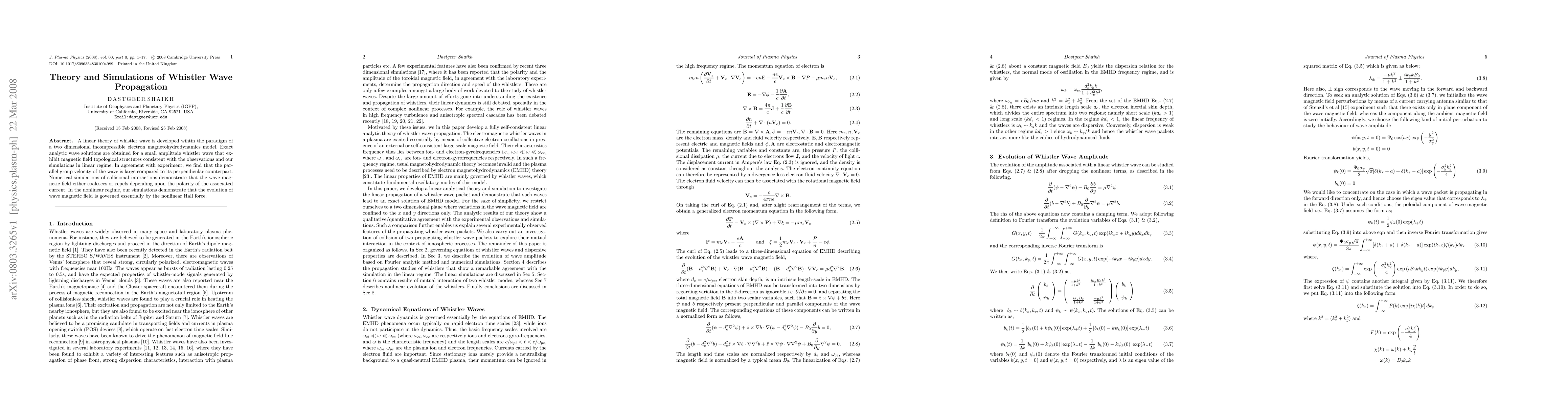 This paper develops a linear theory for whistler wave propagation in a two-dimensional electron magnetohydrodynamics model, deriving exact analytic solutions that match observational data. Simulations show that the wave's magnetic field behavior depends on current polarity, and in the nonlinear regime, the evolution is dominated by the nonlinear Hall force.