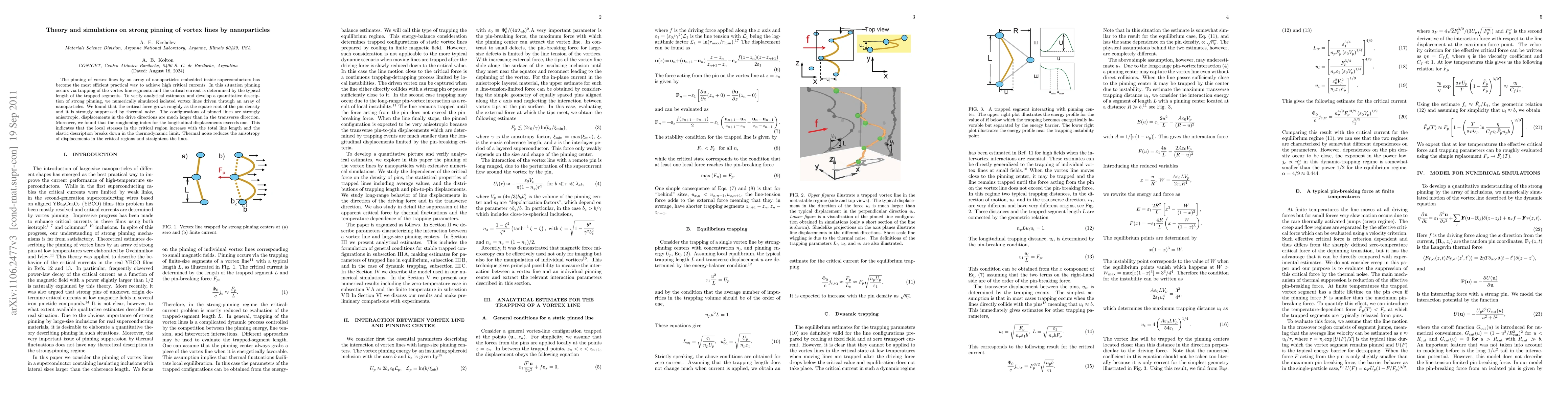 The pinning of vortex lines by an array of nanoparticles embedded inside superconductors has become the most efficient practical way to achieve high critical currents. In this situation pinning occurs via trapping of the vortex-line segments and the critical current is determined by the typical length of the trapped segments. To verify analytical estimates and develop a quantitative description of strong pinning, we numerically simulated isolated vortex lines driven through an array of nanoparticles. We found that the critical force grows roughly as the square root of the pin density and it is strongly suppressed by thermal noise. The configurations of pinned lines are strongly anisotropic, displacements in the drive directions are much larger than in the transverse direction. Moreover, we found that the roughening index for the longitudinal displacements exceeds one. This indicates that the local stresses in the critical region increase with the total line length and the elastic description breaks down in the thermodynamic limit. Thermal noise reduces the anisotropy of displacements in the critical regions and straightens the lines.