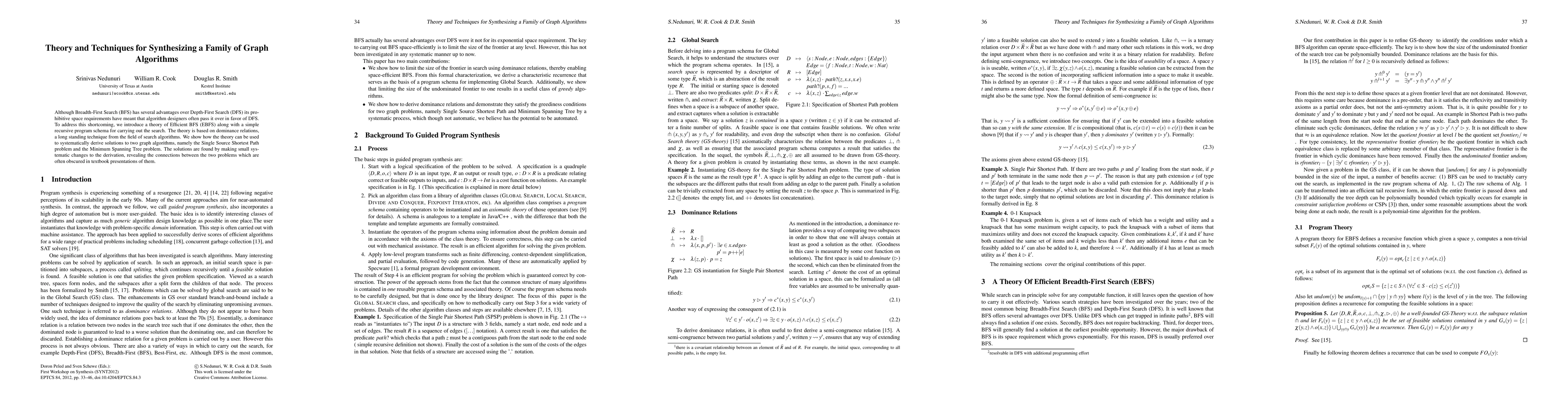 Although Breadth-First Search (BFS) has several advantages over Depth-First Search (DFS) its prohibitive space requirements have meant that algorithm designers often pass it over in favor of DFS. To address this shortcoming, we introduce a theory of Efficient BFS (EBFS) along with a simple recursive program schema for carrying out the search. The theory is based on dominance relations, a long standing technique from the field of search algorithms. We show how the theory can be used to systematically derive solutions to two graph algorithms, namely the Single Source Shortest Path problem and the Minimum Spanning Tree problem. The solutions are found by making small systematic changes to the derivation, revealing the connections between the two problems which are often obscured in textbook presentations of them.
