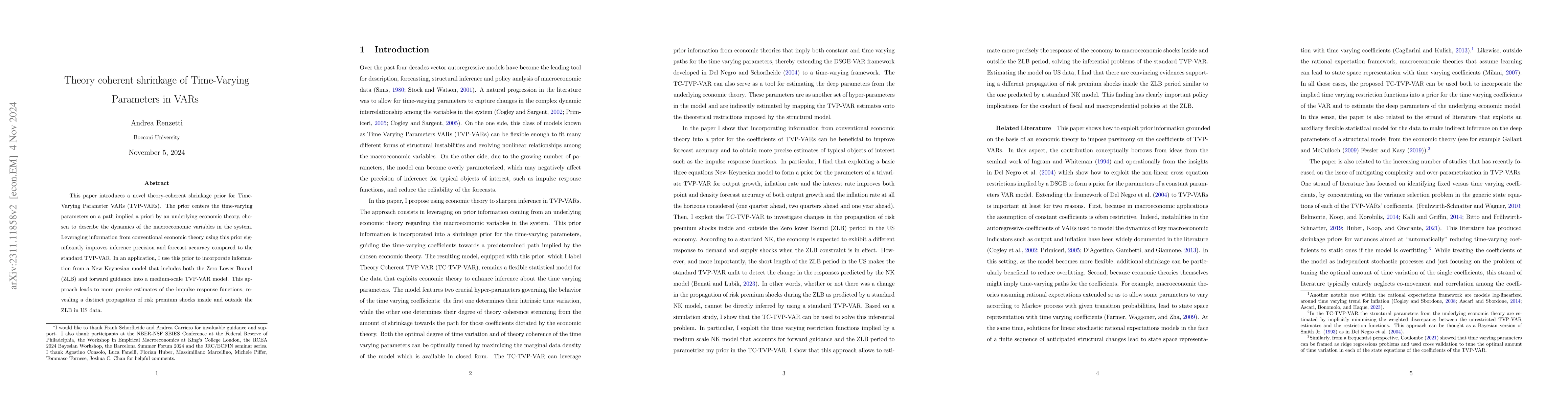 This paper proposes a Theory Coherent Time-Varying Parameters Vector Autoregressive Model (TC-TVP-VAR) that uses economic theory to form a prior, improving inference precision and forecast accuracy over standard TVP-VAR models. The approach notably enhances predictions of output growth and inflation during monetary policy models and addresses inferential challenges during the Zero Lower Bound period.