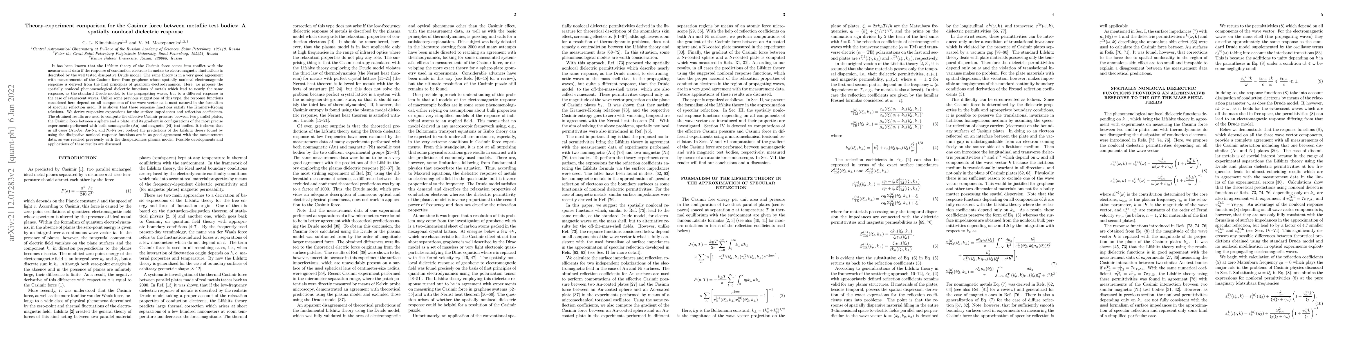 This paper proposes spatially nonlocal dielectric functions for metals to reconcile discrepancies between Lifshitz theory predictions for the Casimir force and experimental data, particularly for metallic test bodies. The new model, which satisfies Kramers-Kronig relations, provides a better fit to measurements compared to the standard Drude model, leading to improved agreement with experimental results for various configurations.