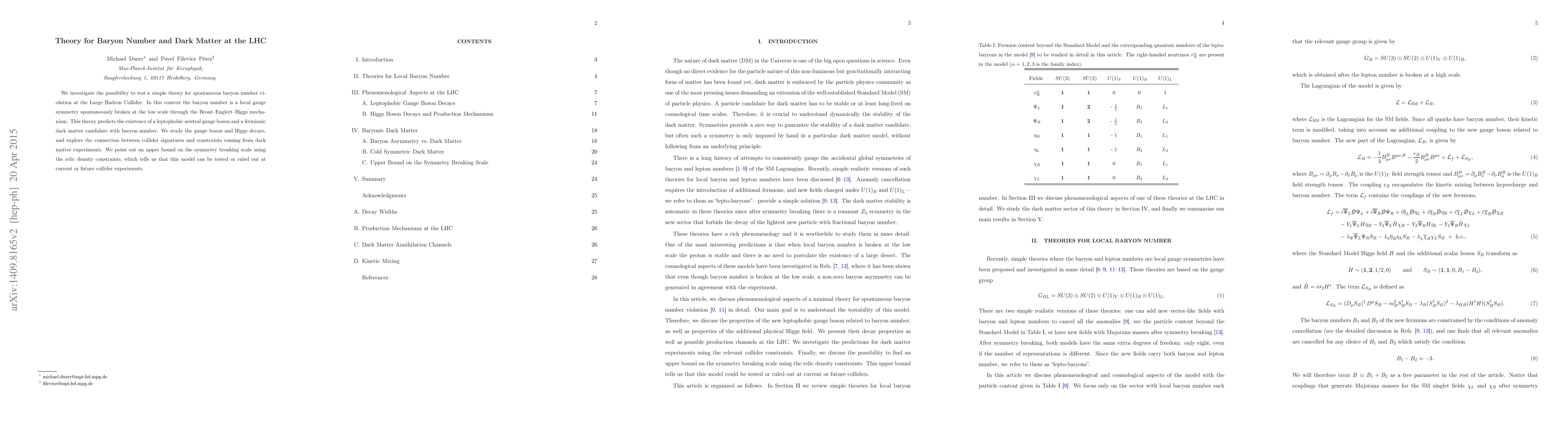 This paper explores a theory of spontaneous baryon number violation at the LHC, predicting a leptophobic neutral gauge boson and baryonic dark matter. It examines the collider signatures and constraints from dark matter experiments, concluding that the model can be tested or ruled out using current or future collider experiments.