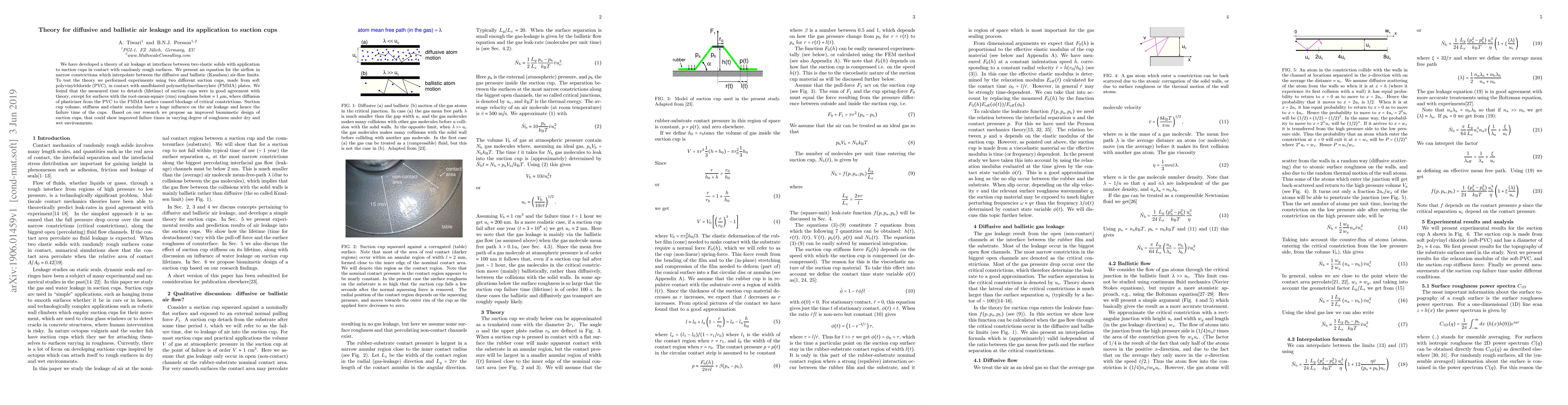 This paper develops a theoretical model for air leakage between two elastic solids, specifically applied to suction cups on rough surfaces. Experimental results show good agreement between the model and suction cup lifetimes, except for very smooth surfaces where plasticizer diffusion affects performance.