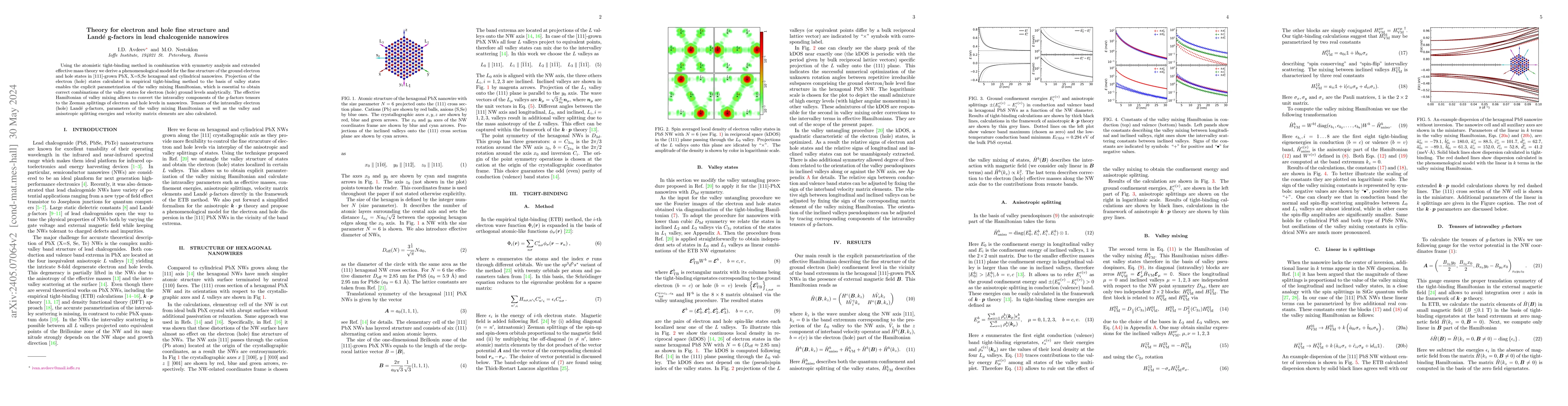 Using the atomistic tight-binding method in combination with symmetry analysis and extended effective mass theory we derive a phenomenological model for the fine structure of the ground electron and hole states in $[111]$-grown PbX, X=S,Se hexagonal and cylindrical nanowires. Projection of the tight-binding states to the basis of valley states enables the explicit parametrization of the valley mixing Hamiltonian, which is essential to obtain correct combinations of the valley states for electron (hole) ground levels analytically. The effective Hamiltonian of valley mixing allows to convert the intravalley components of the $g$-factors tensors to the Zeeman splittings of electron and hole levels in nanowires.Tensors of the intravalley electron (hole) Land\'e $g$-factors, parameters of the valley mixing Hamiltonian as well as the valley and anisotropic splitting energies and velocity matrix elements are also calculated.