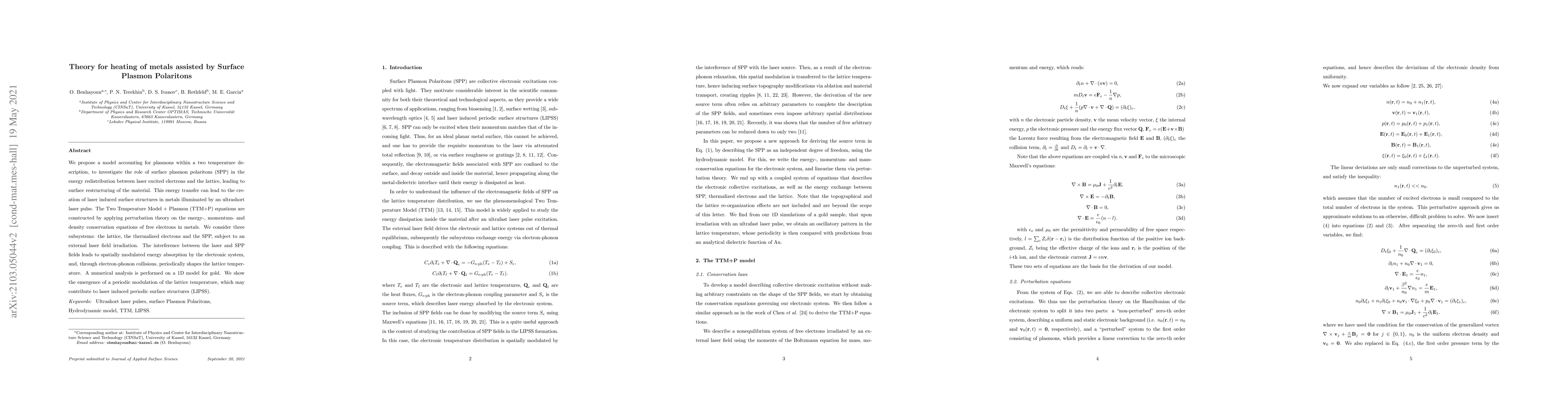 We propose a model accounting for plasmons within a two temperature description, to investigate the role of surface plasmon polaritons (SPP) in the energy redistribution between laser excited electrons and the lattice, leading to surface restructuring of the material. This energy transfer can lead to the creation of laser induced surface structures in metals illuminated by an ultrashort laser pulse. The Two Temperature Model + Plasmon (TTM+P) equations are constructed by applying perturbation theory on the energy-, momentum- and density conservation equations of free electrons in metals. We consider three subsystems: the lattice, the thermalized electrons and the SPP, subject to an external laser field irradiation. The interference between the laser and SPP fields leads to spatially modulated energy absorption by the electronic system, and, through electron-phonon collisions, periodically shapes the lattice temperature. A numerical analysis is performed on a 1D model for gold. We show the emergence of a periodic modulation of the lattice temperature, which may contribute to laser induced periodic surface structures (LIPSS).