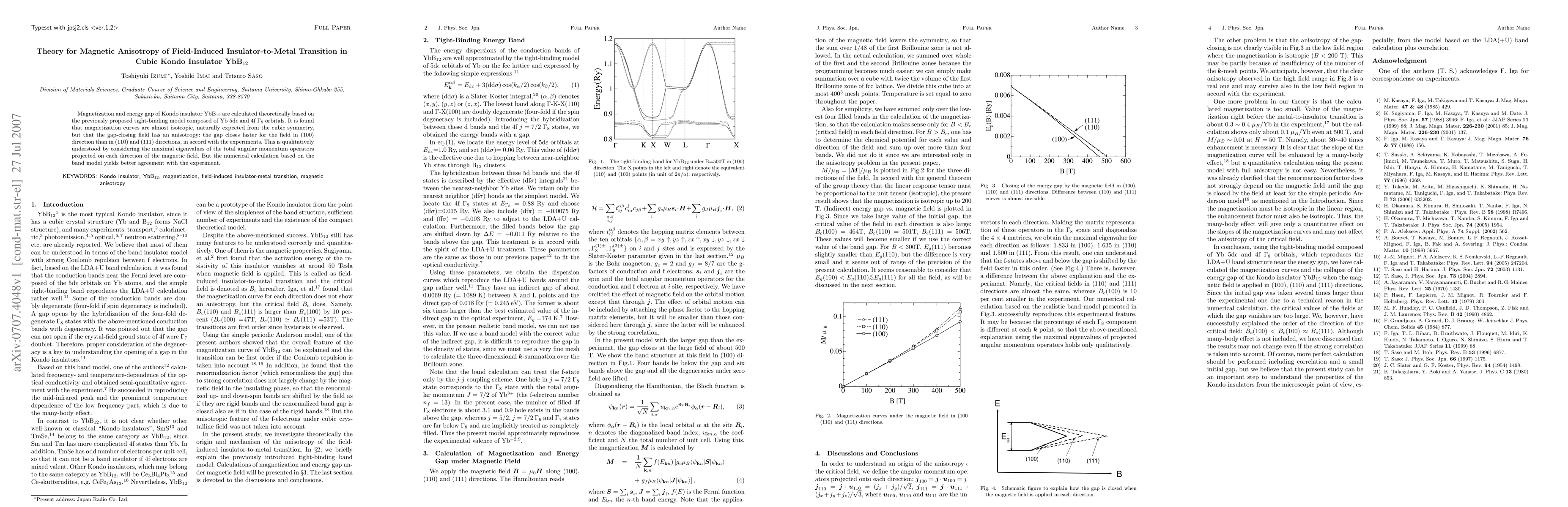 Magnetization and energy gap of Kondo insulator YbB_{12} are calculated theoretically based on the previously proposed tight-binding model composed of Yb 5d$\epsilon$ and 4f $\Gamma_8$ orbitals. It is found that magnetization curves are almost isotropic, naturally expected from the cubic symmetry, but that the gap-closing field has an anisotropy: the gap closes faster for the field in (100) direction than in (110) and (111) directions, in accord with the experiments. This is qualitatively understood by considering the maximal eigenvalues of the total angular momentum operators projected on each direction of the magnetic field. But the numerical calculation based on the band model yields better agreement with the experiment.