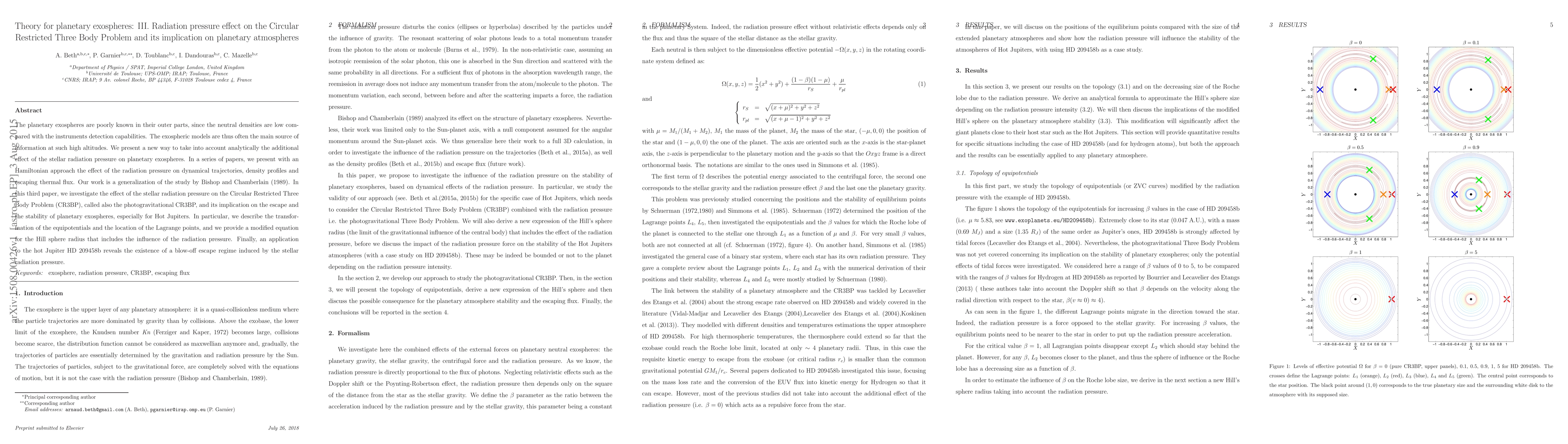 The planetary exospheres are poorly known in their outer parts, since the neutral densities are low compared with the instruments detection capabilities. The exospheric models are thus often the main source of information at such high altitudes. We present a new way to take into account analytically the additional effect of the stellar radiation pressure on planetary exospheres. In a series of papers, we present with an Hamiltonian approach the effect of the radiation pressure on dynamical trajectories, density profiles and escaping thermal flux. Our work is a generalization of the study by Bishop and Chamberlain (1989). In this third paper, we investigate the effect of the stellar radiation pressure on the Circular Restricted Three Body Problem (CR3BP), called also the photogravitational CR3BP, and its implication on the escape and the stability of planetary exospheres, especially for Hot Jupiters. In particular, we describe the transformation of the equipotentials and the location of the Lagrange points, and we provide a modified equation for the Hill sphere radius that includes the influence of the radiation pressure. Finally, an application to the hot Jupiter HD 209458b reveals the existence of a blow-off escape regime induced by the stellar radiation pressure.