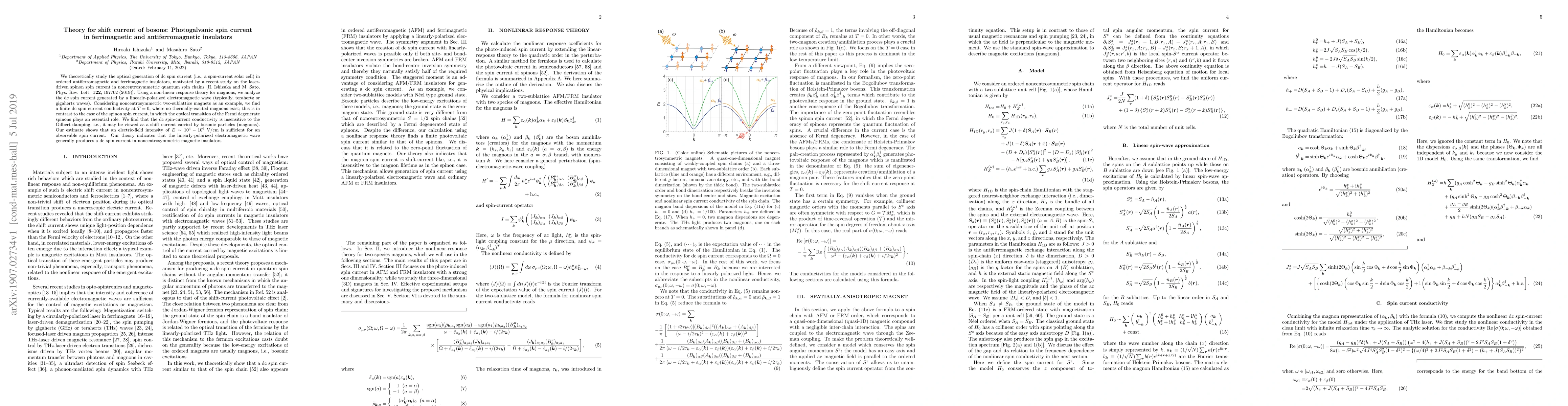 This paper theoretically investigates the optical generation of a direct current (dc) spin current in antiferromagnetic and ferrimagnetic insulators using non-linear response theory for magnons. It finds that a dc spin current can be generated by linearly-polarized electromagnetic waves, independent of thermal magnons, and driven by bosonic particles (magnons), suggesting a potential for spin-current solar cells.