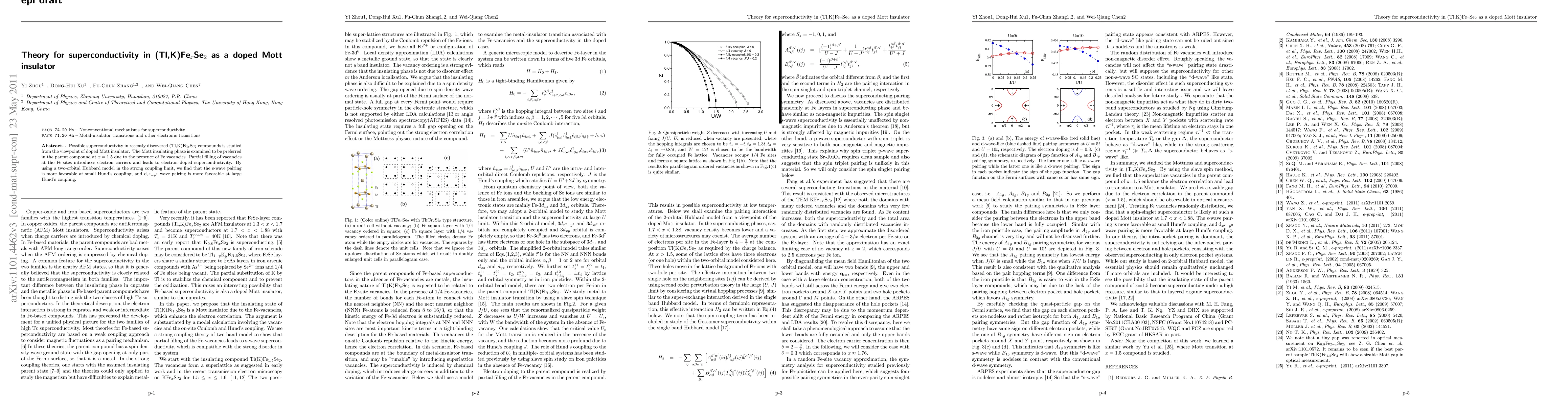 This paper explores the superconductivity in (Tl,K)Fe$_x$Se$_2$ compounds, proposing a doped Mott insulator theory. It finds that electron doping from Fe vacancies leads to superconductivity, with s-wave pairing favored at low Hund's coupling and d$_{x^2-y^2}$ pairing at high coupling.