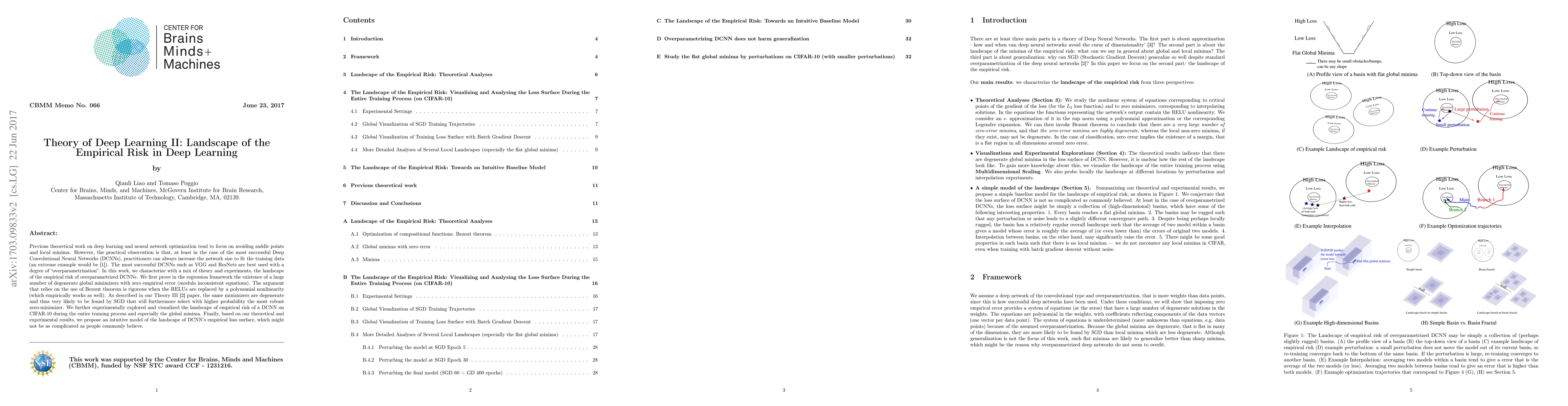 Previous theoretical work on deep learning and neural network optimization tend to focus on avoiding saddle points and local minima. However, the practical observation is that, at least in the case of the most successful Deep Convolutional Neural Networks (DCNNs), practitioners can always increase the network size to fit the training data (an extreme example would be [1]). The most successful DCNNs such as VGG and ResNets are best used with a degree of "overparametrization". In this work, we characterize with a mix of theory and experiments, the landscape of the empirical risk of overparametrized DCNNs. We first prove in the regression framework the existence of a large number of degenerate global minimizers with zero empirical error (modulo inconsistent equations). The argument that relies on the use of Bezout theorem is rigorous when the RELUs are replaced by a polynomial nonlinearity (which empirically works as well). As described in our Theory III [2] paper, the same minimizers are degenerate and thus very likely to be found by SGD that will furthermore select with higher probability the most robust zero-minimizer. We further experimentally explored and visualized the landscape of empirical risk of a DCNN on CIFAR-10 during the entire training process and especially the global minima. Finally, based on our theoretical and experimental results, we propose an intuitive model of the landscape of DCNN's empirical loss surface, which might not be as complicated as people commonly believe.