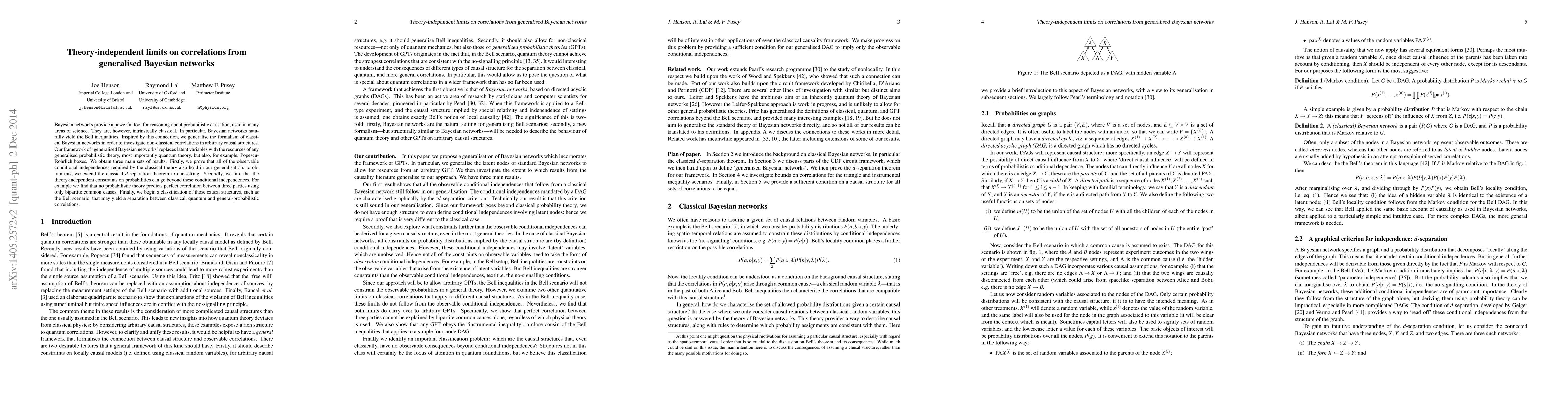 Bayesian networks provide a powerful tool for reasoning about probabilistic causation, used in many areas of science. They are, however, intrinsically classical. In particular, Bayesian networks naturally yield the Bell inequalities. Inspired by this connection, we generalise the formalism of classical Bayesian networks in order to investigate non-classical correlations in arbitrary causal structures. Our framework of `generalised Bayesian networks' replaces latent variables with the resources of any generalised probabilistic theory, most importantly quantum theory, but also, for example, Popescu-Rohrlich boxes. We obtain three main sets of results. Firstly, we prove that all of the observable conditional independences required by the classical theory also hold in our generalisation; to obtain this, we extend the classical $d$-separation theorem to our setting. Secondly, we find that the theory-independent constraints on probabilities can go beyond these conditional independences. For example we find that no probabilistic theory predicts perfect correlation between three parties using only bipartite common causes. Finally, we begin a classification of those causal structures, such as the Bell scenario, that may yield a separation between classical, quantum and general-probabilistic correlations.