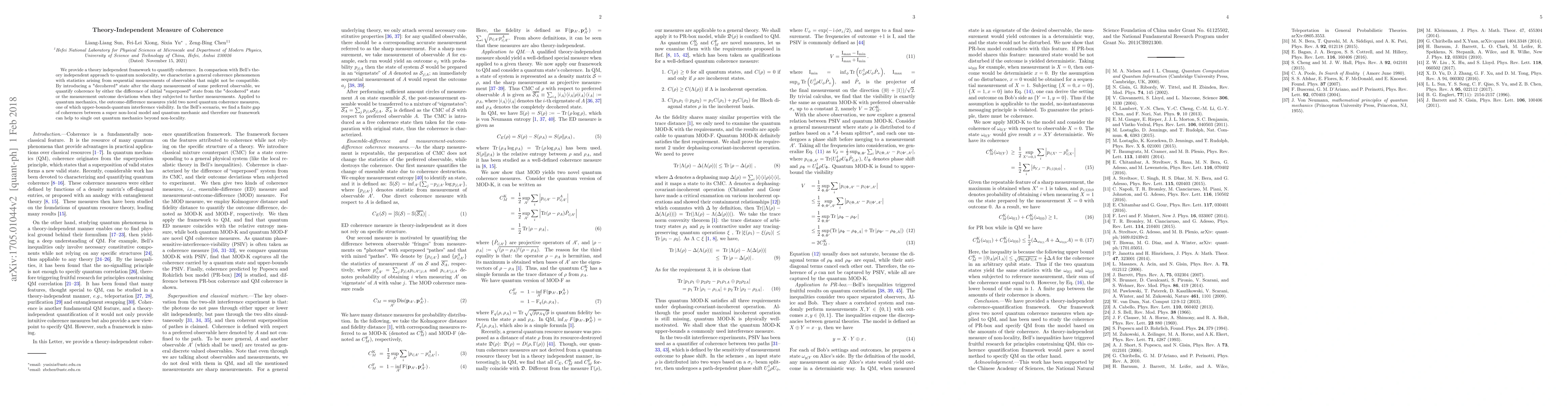 We provide a theory independent framework to quantify coherence. In comparison with Bell's theory independent approach to quantum nonlocality, we characterize a general coherence phenomenon with statistics arising from sequential measurements of observables that might not be compatible. By introducing a "decohered" state after the sharp measurement of some preferred observable, we quantify coherence by either the difference of initial "superposed" state from the "decohered" state or the measurement outcome deviations when they subjected to further measurements. Applied to quantum mechanics, the outcome-difference measures yield two novel quantum coherence measures, one of which upper-bounds quantum interference visibility. In the Bell's scenario, we find a finite gap of coherences between a super non-local model and quantum mechanic and therefore our framework can help to single out quantum mechanics beyond non-locality.
