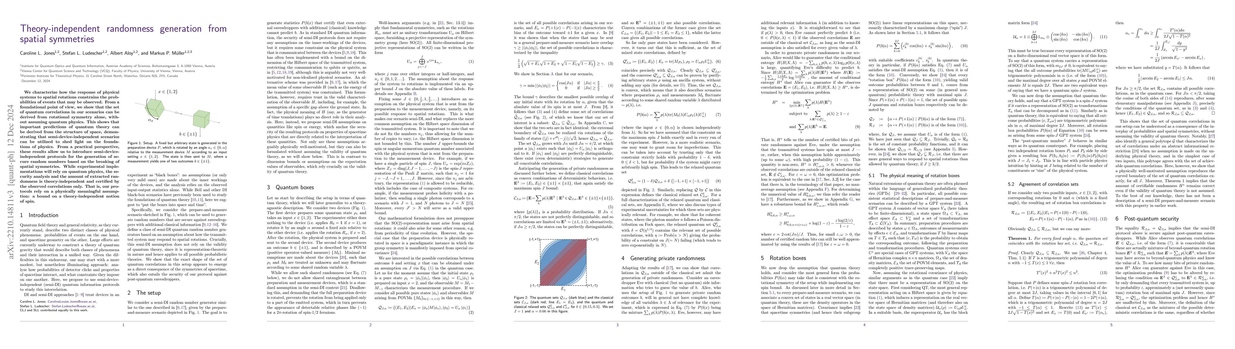 We introduce a class of semi-device-independent protocols based on the breaking of spacetime symmetries. In particular, we characterise how the response of physical systems to spatial rotations constrains the probabilities of events that may be observed: in our setup, the set of quantum correlations arises from rotational symmetry without assuming quantum physics. On a practical level, our results allow for the generation of secure random numbers without trusting the devices or assuming quantum theory. On a fundamental level, we open a theory-agnostic framework for probing the interplay between probabilities of events (as prevalent in quantum mechanics) and the properties of spacetime (as prevalent in relativity).