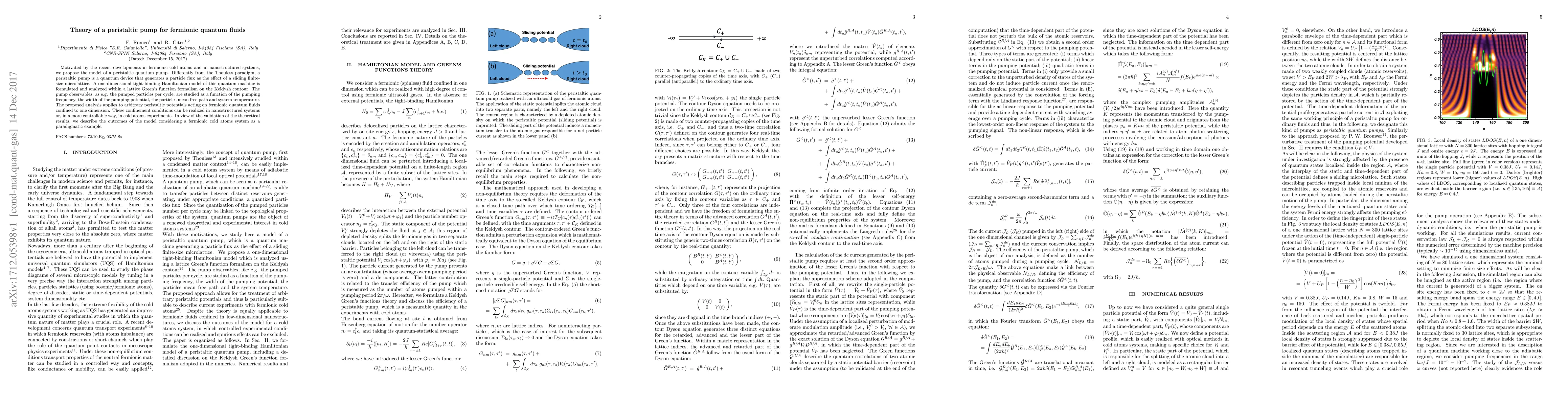 Motivated by the recent developments in fermionic cold atoms and in nanostructured systems, we propose the model of a peristaltic quantum pump. Differently from the Thouless paradigm, a peristaltic pump is a quantum device that generates a particle flux as the effect of a sliding finite-size microlattice. A one-dimensional tight-binding Hamiltonian model of this quantum machine is formulated and analyzed within a lattice Green's function formalism on the Keldysh contour. The pump observables, as e.g. the pumped particles per cycle, are studied as a function of the pumping frequency, the width of the pumping potential, the particles mean free path and system temperature. The proposed analysis applies to arbitrary peristaltic potentials acting on fermionic quantum fluids confined to one dimension. These confinement conditions can be realized in nanostructured systems or, in a more controllable way, in cold atoms experiments. In view of the validation of the theoretical results, we describe the outcomes of the model considering a fermionic cold atoms system as a paradigmatic example.