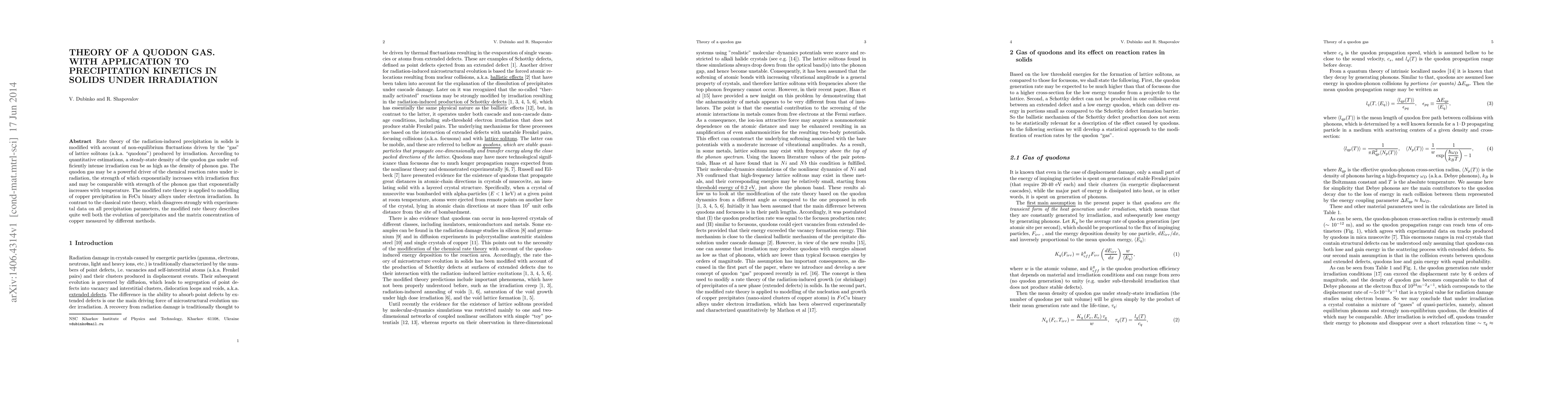 This paper proposes a modified rate theory for radiation-induced precipitation in solids, incorporating lattice solitons (quodons) as a quodon gas driven by irradiation. The model predicts that the quodon gas can significantly enhance chemical reaction rates, and it accurately describes copper precipitation in FeCu alloys under electron irradiation, unlike the classical rate theory.