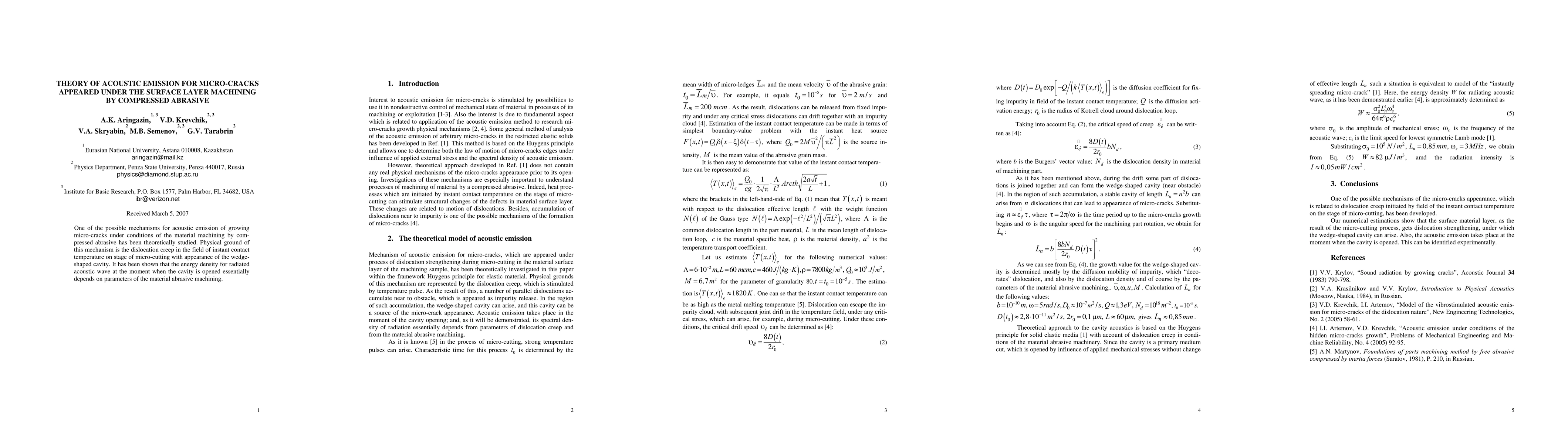 This paper theoretically investigates the acoustic emission mechanism of micro-cracks during surface layer machining by compressed abrasive, attributing it to dislocation creep under high contact temperatures. The study finds that the energy density of the emitted acoustic wave significantly depends on the material and machining parameters.