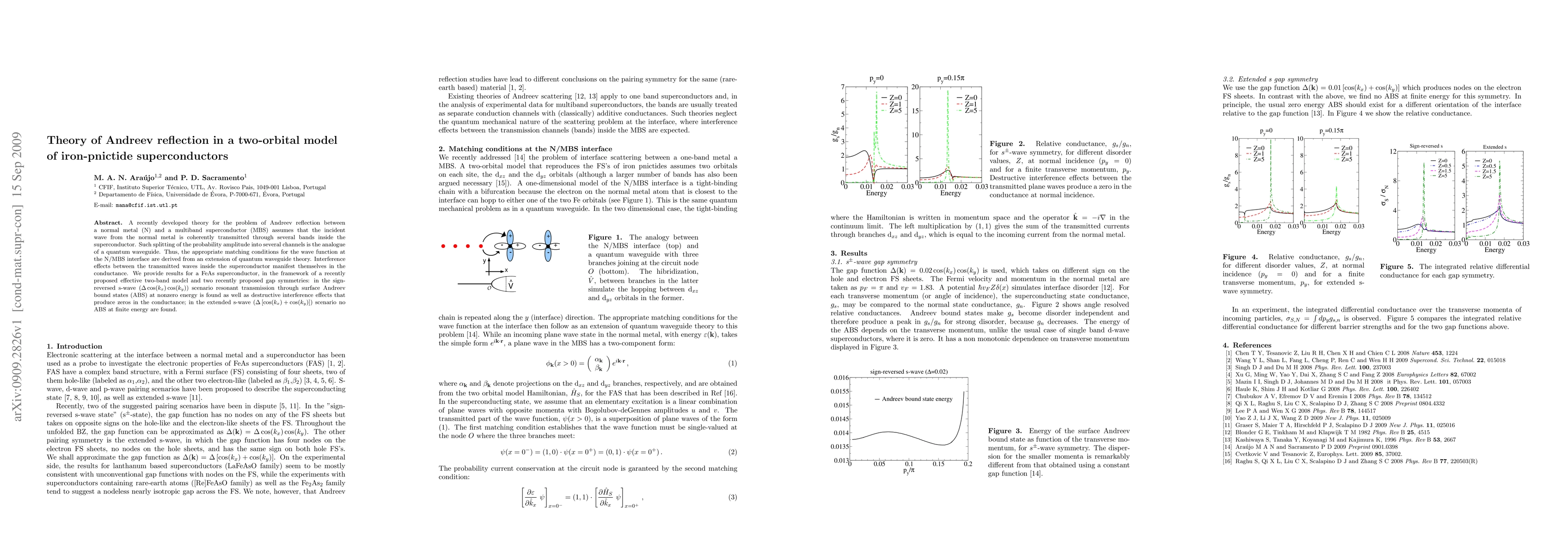 A recently developed theory for the problem of Andreev reflection between a normal metal (N) and a multiband superconductor (MBS) assumes that the incident wave from the normal metal is coherently transmitted through several bands inside the superconductor. Such splitting of the probability amplitude into several channels is the analogue of a quantum waveguide. Thus, the appropriate matching conditions for the wave function at the N/MBS interface are derived from an extension of quantum waveguide theory. Interference effects between the transmitted waves inside the superconductor manifest themselves in the conductance. We provide results for a FeAs superconductor, in the framework of a recently proposed effective two-band model and two recently proposed gap symmetries: in the sign-reversed s-wave ($\Delta\cos(k_x)\cos(k_y)$) scenario resonant transmission through surface Andreev bound states (ABS) at nonzero energy is found as well as destructive interference effects that produce zeros in the conductance; in the extended s-wave ($\Delta[\cos(k_x)+\cos(k_y)]$) scenario no ABS at finite energy are found.