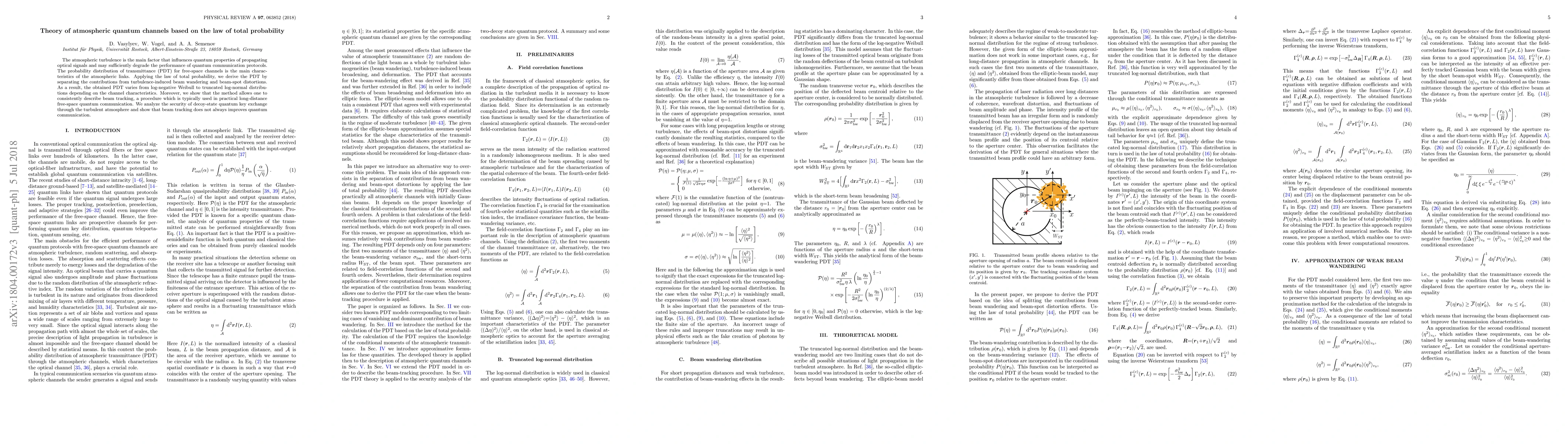 The atmospheric turbulence is the main factor that influences quantum properties of propagating optical signals and may sufficiently degrade the performance of quantum communication protocols. The probability distribution of transmittance (PDT) for free-space channels is the main characteristics of the atmospheric links. Applying the law of total probability, we derive the PDT by separating the contributions from turbulence-induced beam wandering and beam-spot distortions. As a result, the obtained PDT varies from log-negative Weibull to truncated log-normal distributions depending on the channel characteristics. Moreover, we show that the method allows one to consistently describe beam tracking, a procedure which is typically used in practical long-distance free-space quantum communication. We analyze the security of decoy-state quantum key exchange through the turbulent atmosphere and show that beam tracking does not always improves quantum communication.